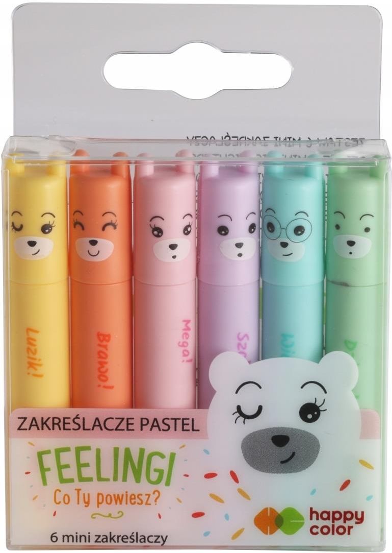 ZAKREŚLACZE MINI PASTELOWE FEELINGI HAPPY COLOR 6 SZT. Producent: Happy Color Kod produktu: HA 4130 01PA-WP6 Na obudowie nadrukowane śmieszne hasła, na skuwce śmieszne minki. Na końcu obudowy uchwyt-zawieszka. Zestaw zawiera 6 kolorów. Grubość linii zakreślenia 3 mm.