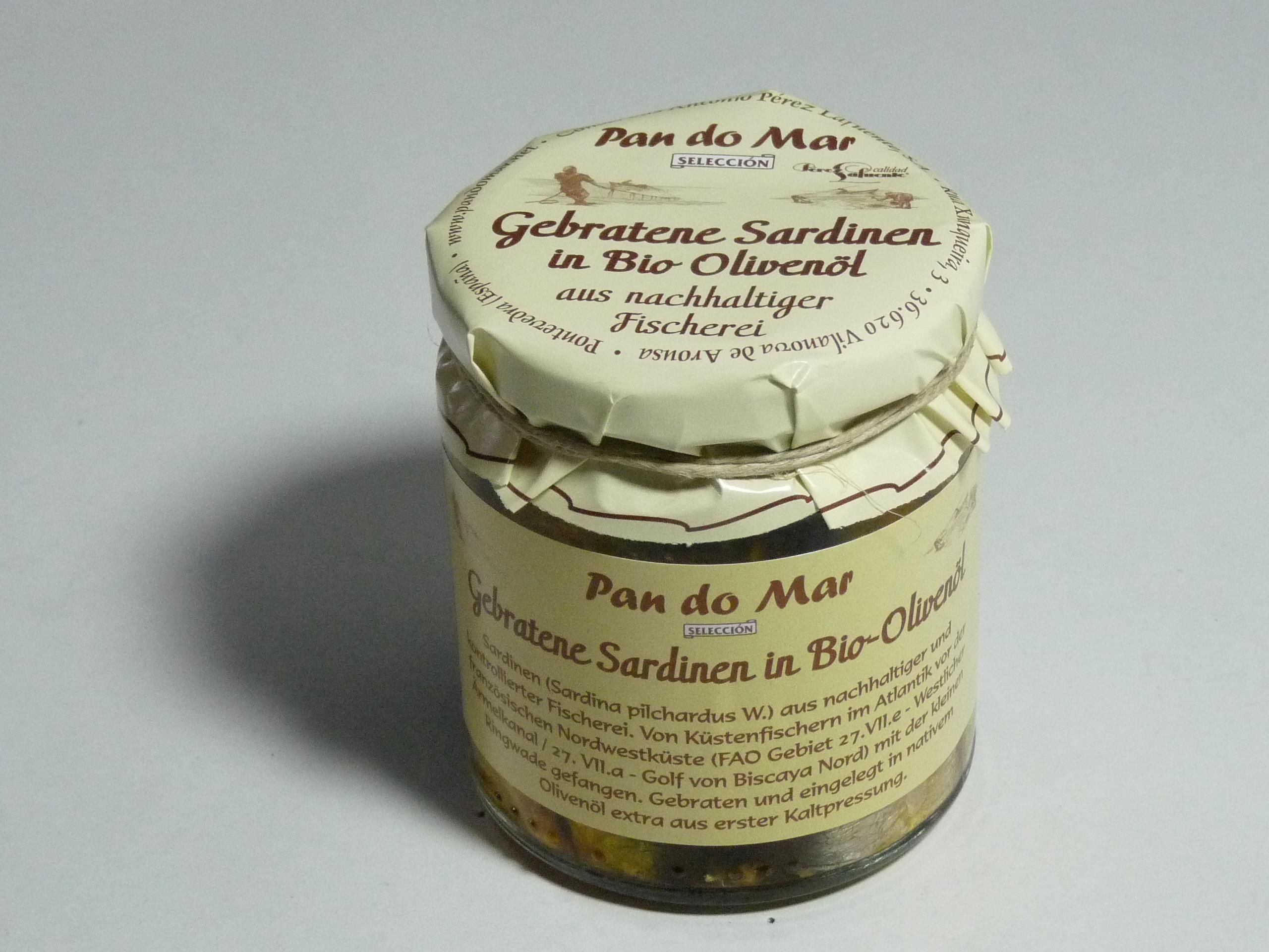 SARDYNKI EUROPEJSKIE SMAŻONE W BIO OLIWIE Z OLIWEK EXTRA VIRGIN 220 g (154 PAN DO MAR (rybołówstwo zrównoważone) SKŁADNIKIsmażone filety z SARDYNKI europejskiej 70 %, ekologiczna oliwa z oliwek extra virgin 29 %, sól morska. 29 % składników pochodzi z certyfikowanych upraw ekologicznych.OPISSmażone filety z SARDYNKI europejskiej w ekologicznej oliwie z oliwek extra virgin. Produkt sterylizowany. Sardynka europejska (Sardina pilchardus), złowiona w północno-wschodnim Oceanie Atlantyckim (FAO 27.VII.e/VIII.a-b-c), podobszar połowu: Zatoka Biskajska. WARTOŚĆ ODŻYWCZA W 100 g PO ODSĄCZENIUEnergia: 1171 kJ/281 kcalTłuszcz: 19,8 gw tym kwasy nasycone: 4,7 g jednonienasycone: 3,8 g wielonienasycone: 0,9 g Węglowodany: 1,8 g w tym cukry: <0,5 g Błonnik: <0,2 g Białko: 23,9 g Sól: 0,4 g ZALECANE WARUNKI PRZECHOWYWANIAPo otwarciu przechowywać w lodówce i spożyć w ciągu 3 dni. Kraj pochodzenia: Hiszpania Ilość w opakowaniu zbiorczym: 1 Wysokość opakowania jednostkowego (cm): 8.50 Głębokość opakowania jednostkowego (cm): 7.00 Masa netto (g): 220 Gwarantowany termin przydatności (w dniach): 360 Szerokość opakowania jednostkowego (cm): 7.00 Producent: PAN DO MAR (rybołówstwo zrównoważone) Bez Cukru: BEZ CUKRU (w składnikach) Kraj pochodzenia składników (słownik BP): Hiszpania Producent - nazwa i adres: ANTONIO PÉREZ LAFUENTE. S.A. . C/ XUNQUEIRA 3. 36620 VILANOVA DE AROUSA (PONTEVEDRA) BEZ GLUTENU (w składnikach): BEZ GLUTENU (w składnikach) Certyfikaty inne: Zrównoważone rybołóstwo