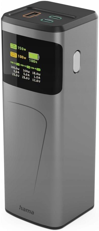 2017420000 HAMA POWER PACK "HIGH POWER 150" 24000 mAh Energia zawsze pod ręką – Hama Power Pack 150 W 24000 mAh Funkcjonalność Aż 150 W mocy – szybkie ładowanie laptopów, tabletów i smartfonów Pojemność 24000 mAh – wielokrotne ładowanie bez potrzeby podłączenia do gniazdka Trzy porty – dwa USB-C i jedno USB-A do jednoczesnego zasilania kilku urządzeń Obsługa Power Delivery 3.0 i Qualcomm® Quick Charge™ 3.0 Kolorowy wyświetlacz TFT pokazujący poziom energii i moc ładowania Tryb Low Power – do ładowania słuchawek, smartwatchy i małych urządzeń Zabezpieczenie przed przeładowaniem, przegrzaniem i zwarciem Kompaktowa konstrukcja w kolorze Gun Metal Grey Ekologiczne opakowanie bez plastiku, z certyfikatem FSC Szybkie ładowanie urządzeń Hama Power Pack o mocy 150 W zapewnia błyskawiczne ładowanie nawet sprzętów o dużym poborze energii – laptopów, konsol przenośnych czy smartfonów. Dzięki technologiom Power Delivery 3.0 i Quick Charge™ 3.0 energia trafia tam, gdzie jest potrzebna, w rekordowym czasie. Maksymalna wydajność w podróży Z pojemnością 24000 mAh powerbank pozwala ładować do trzech urządzeń jednocześnie – przez dwa porty USB-C i jeden USB-A. To idealny towarzysz podczas podróży, pracy zdalnej lub weekendowego wyjazdu, gdy dostęp do prądu jest ograniczony. Inteligentna ochrona i trwałość Powerbank Hama Power Pack wykorzystuje certyfikowane ogniwa Li-Ion oraz inteligentny system ochrony, który zapobiega przegrzaniu, przepięciom i zwarciom. Zoptymalizowany proces ładowania wydłuża żywotność baterii w podłączonych urządzeniach. Pełna kontrola energii Wbudowany kolorowy wyświetlacz TFT prezentuje dokładne dane o stanie naładowania oraz mocy wyjściowej. Dzięki temu użytkownik zawsze wie, ile energii pozostało i które porty są aktywne. Kompaktowy design i ekologia Elegancka obudowa w kolorze Gun Metal Grey łączy solidność z poręcznością – powerbank zmieści się w torbie, plecaku lub kieszeni. Ekologiczne opakowanie wykonane bez plastiku z materiałów z certyfikatem FSC podkreśla dbałość o środowisko. Specyfikacja techniczna Produkt: Hama Power Pack 150 W Kolor: Szary (Gun Metal Grey) Pojemność: 24000 mAh Maksymalna moc wyjściowa: 150 W Porty: 2× USB-C, 1× USB-A Technologie: Power Delivery 3.0, Qualcomm® Quick Charge™ 3.0 Tryb: Low Power dla urządzeń o niskim poborze mocy Wyświetlacz: Kolorowy TFT (poziom naładowania, moc wyjściowa) Zabezpieczenia: ochrona przed przeładowaniem, przegrzaniem, zwarciem i przeciążeniem Wymiary: 56,27 × 160 × 56,27 mm Waga: 639 g Akumulator: Wbudowany Li-Ion Zestaw: kabel USB-C w komplecie Zastosowanie: smartfony, tablety, laptopy, smartwatche, słuchawki Opakowanie: bez plastiku, materiały z certyfikatem FSC
