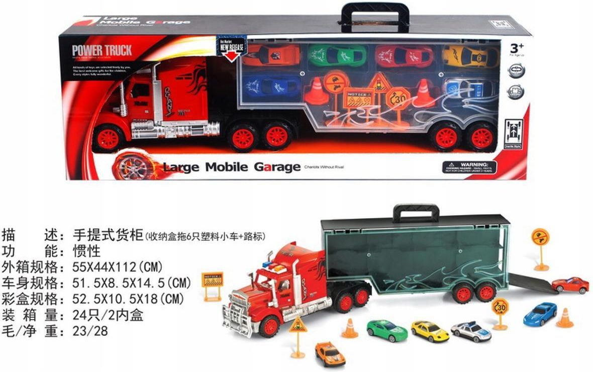 Opis Ciężarówka Garaż + Autka Duża ciężarówka z naczepą, autkami i akcesoriami dla dzieci od 3-go roku życia. Zabawka wykonana została ze świetnej jakości materiałów, w żywych kolorach. Duża ciężarówka posiada naczepę, w której znajduje się 6 autek, znaki drogowe i słupki. Naczepę możemy odłączać od pojazdu, wówczas uzyskamy walizkę na pojazdy z wygodną rączką do przenoszenia. Tylne drzwi naczepy są otwierane i tworzą platformę do wyjeżdżania pojazdów ze środka. Funkcje zestawu odpowiedni dla dzieci powyżej 3-go roku życia, wykonany z wytrzymałych materiałów, żywe kolory przyciągają uwagę dziecka, odczepiana naczepa pojazdu, otwierany tył i boki naczepy, wygodna rączka do przenoszenia, bogate wyposażenie. Wymiary ciężarówka z naczepą ok. 51 cm x 14 cm x 8 cm, resoraki ok. 7 cm x 2,5 cm x 3 cm, znaki mniejsze ok. 4,5 cm wysokości, większe ok. 6,5 cm wysokości, słupki ok. 3 cm x 2,5 cm, walizka po odłączeniu od ciężarówki ok.32 cm x 14 cm x 8 cm, opakowanie ok. 53 cm x 18 cm x 10 cm. Zawartość zestawu ciężarówka z naczepą, 6 pojazdów - resoraków, 4 znaki drogowe, 2 słupki.