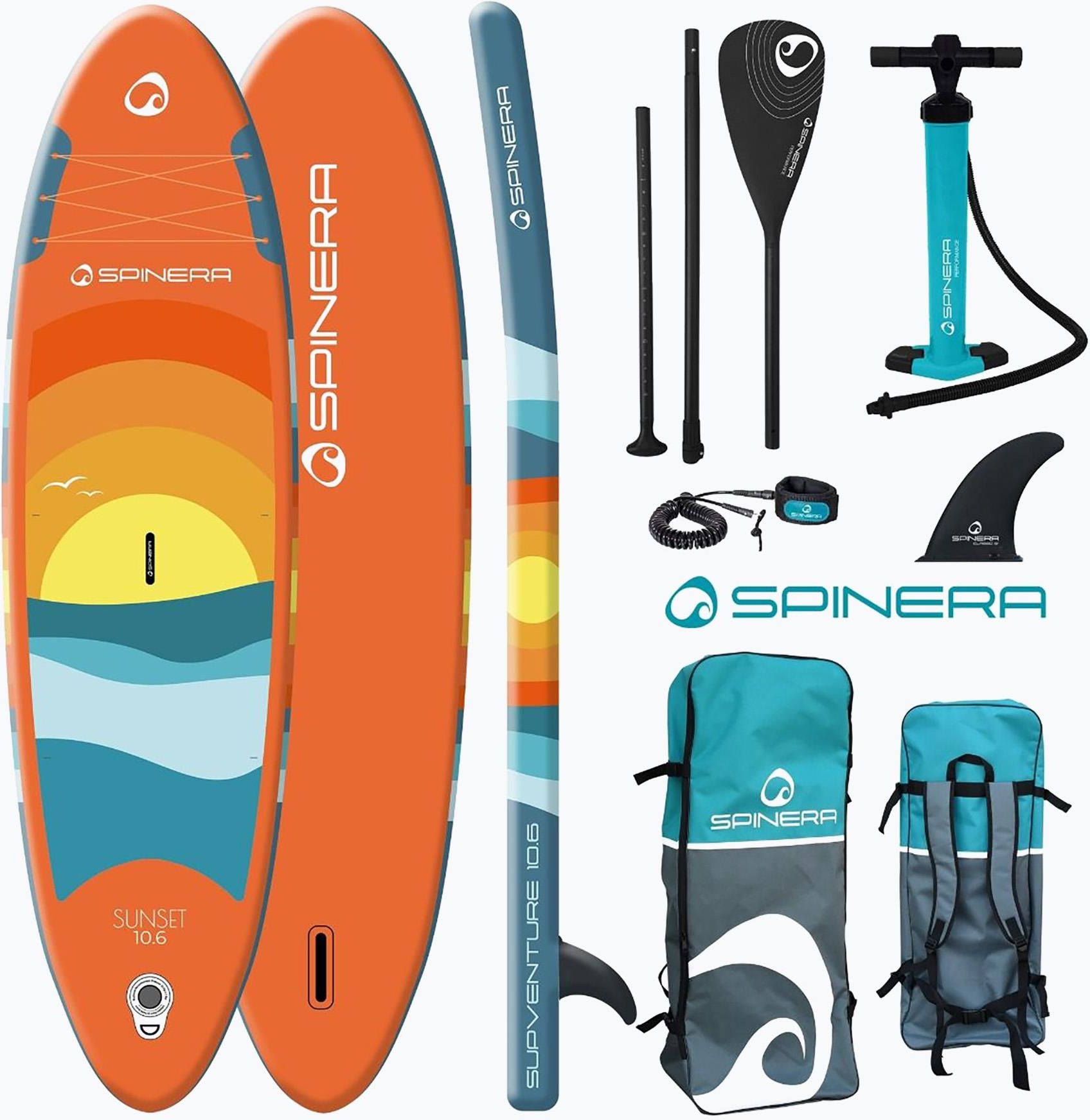 Odkryj nową edycję naszego udanego modelu Spinera Supventure - zupełnie nową deskę SUP Spinera Supventure Sunset 10.6! Dzięki sprawdzonej technologii dwuwarstwowej i wszechstronnemu zakresowi zastosowań, ta deska jest idealna zarówno dla początkujących, jak i zaawansowanych wioślarzy. Deska SUP Spinera Supventure Sunset 10.6 łączy w sobie solidność, stabilność i wydajność w imponującej konstrukcji. Dzięki technologii dwuwarstwowej deska jest wyjątkowo odporna i trwała, dzięki czemu może wytrzymać naprężenia i obciążenia na wodzie i zapewnić lata przyjemności. Kompletny zestaw Spinera Supventure Sunset 10.6 zawiera wszystko, czego potrzebujesz do następnej przygody SUP. Wysokiej jakości aluminiowe wiosło z włókna szklanego zapewnia mocne i precyzyjne pociągnięcia wiosłem, a dzięki swojej wadze jest dziecinnie proste, podczas gdy pompka o podwójnym działaniu zapewnia szybkie i łatwe pompowanie deski. Smycz zapewnia bezpieczne połączenie z deską przez cały czas, a przestronna torba transportowa oferuje wygodne i łatwe przechowywanie i transport. Niezależnie od tego, czy chcesz zrelaksować się na spokojnych jeziorach, czy zanurzyć się w ekscytujących falach, deska SUP Spinera Supventure Sunset 10.6 jest Twoim niezawodnym towarzyszem. Odkryj wolność wiosłowania na stojąco i przeżyj niezapomniane chwile na wodzie z deską Spinera Supventure Sunset 10.6! Szczegóły:- Sportowy, wszechstronny SUP do wiosłowania- Rozmiar: 320 cm x 80 cm x 15 cm- Waga ridera: do 110 kg- Maksymalne obciążenie: 145 kg- Pojemność: 312 litrów- Waga netto: 12,4 kg- Waga brutto: 14,2 kg Wykonanie:- 15 cm DLT - Fusion Double Layer Technology Dropstitch- Podwójna warstwa- Formowana powierzchnia z pianki EVA z diamentowym nacięciem- 6-punktowa linka bungee / siatka transportowa Zakres dostawy:Deska SUP, plecak, wydajna pompka z podwójnym podnośnikiem, regulowane w 3 kierunkach wydajne wiosło aluminiowe / z włókna szklanego, wsuwana środkowa płetwa i zestaw naprawczy bez kleju UWAGA: Zdecydowanie zalecamy noszenie kamizelki asekuracyjnej podczas korzystania z deski SUP. Środki wypornościowe zapewniają pływalność po upadku do wody i utrzymują zdolność pływania i działania. Kamizelka asekuracyjna nie wchodzi w zakres dostawy. Zestaw Supventure Sunset 10'6" SUP Spinner i wiosłoSupventure SUP to sportowa deska SUP dla wszystkich poziomów, od początkujących do zaawansowanych. Dzięki manewrowemu, bulwiastemu kształtowi i wyjątkowo mocnemu flexowi, Supventure pozwoli ci wiosłować w każdej wodzie - od stojących wód śródlądowych po fale oceanu. Supventure to idealna deska do pływania i surfowania.Spinera buduje ten SUP z dwóch spawanych warstw PVC na rdzeniu dropstitch. Dzięki temu Supventure jest mniej podatna na uszkodzenia, super sztywna i bardzo trwała. Supventure posiada cztery zintegrowane D-ringi do mocowania siedziska do kajaka i siatkę bagażową na nosie.W tym zestawie kupujesz Supventure z trzyczęściowym wiosłem SUP wykonanym z włókna szklanego.Tabela rozmiarów Spinera Supventure SUPDługośćSzerokośćGłębokośćPojemnośćWaga. Waga ridera10'6' / 320 cm32' / 82 cm6' / 15 cm312 L9 kg110 kgW zestawie: Supventure SUP, 3-częściowe wiosło SUP, płetwa Slide In, torba do pakowania, pompka z podwójnym podnośnikiem, smycz. SUP SPINERA Supventure Sunset 10'6 Brett pomarańczowy 22226
