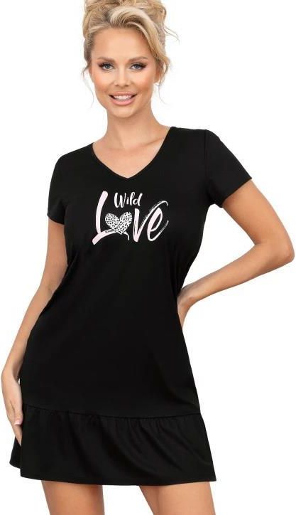 Koszula nocna damska Donna wykonana z wysokogatunkowej bawełny. Koszula z krótkim rękawem jednolita w kolorze czarnym, dekolt w serek, na piersi kolorowy nadruk. Koszulka zakończona marszczoną falbanką. Skład: 100% bawełna