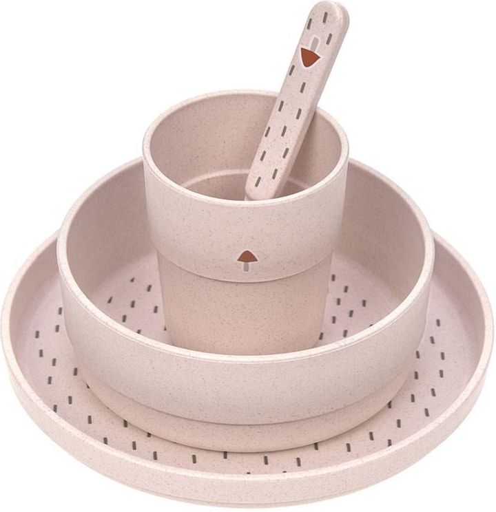 Lassig Komplet Naczyń Dla Dzieci Little Forest Zajączek a Komplet pięknych naczyń z kolekcji Little Forest niemieckiej marki LASSIG. W jego skład wchodzi spory talerz, miska, kubek i łyżeczka – wszystkie elementy utrzymane w bardzo jasnym odcieniu różu, na spodzie talerza i miseczki dodatkowo ozdobione ciemniejszymi kreseczkami oraz grafiką zajączka w kolorze terakoty. Zajączek znajduje się też na uchwycie łyżeczki, z kolei kubeczek zdobi uroczy rudy grzybek. Zestaw wykonany został z najwyższej jakości materiałów – połączenia polipropylenu z celulozą – solidnych, odpornych, nietłukących się i odpowiednich do kontaktu z pożywieniem. Naczynia posiadają antypoślizgowe wykończenie na spodzie, a łyżeczka – odpowiednio wyprofilowany chwyt i główkę. Zestaw jest idealny dla dzieci powyżej 1. roku życia, które uczą się pić i jeść samodzielnie (co ułatwia im m. in. wyższy brzeg i węższy dół naczyń). Komplet jest zapakowany w ładne kartonowe pudełko, idealne na prezent. O kolekcji Kolekcja Little Forest powstała z miłości do natury. Wykorzystuje odnawialne tworzywa i bawełną organiczną – materiały ekologiczne i idealne również dla alergików. Serię zdobią postacie zajączka i liska oraz stonowane graficzne i leśne motywy. Wszystkie produkty – od kompletów naczyń i śliniaków po wyjątkowo miękkie otulacze i kocyki dostępne są w dwóch wersjach kolorystycznych: jasnym różu i pastelowym odcieni oliwki. Można myć w zmywarce i podgrzewać w kuchence mikrofalowej. Wiek: 12 m+ Wymiary: 22,7 x 7,2 x 26 cm Waga: 336 g Skład: PP/celuloza a Lassig to rodzinna firma z Niemiec, tworząca z myślą o współczesnych Mamach, które są świadome swojego stylu, potrzeb i roli społecznej. To nie tylko gwarancja perfekcji i dobrego designu, ale również ekologicznej produkcji i wyboru materiałów. W oparciu o te idee, dbałość o środowisko i szeroko rozumianą odpowiedzialność społeczną marka wypracowała sobie własną filozofię. LIVE LASSIG oznacza zwyczajne życie: rodzinne, pełne ciepła i tradycyjnych wartości, szacunku dla natury i drugiego człowieka. Takie podejście zaowocowało szeregiem branżowych nagród, w tym za innowacyjność i etykę. Ponadto marka Lassig aktywnie wspiera chore dzieci, promuje wychowanie bez przemocy, finansuje szkółki piłkarskie dla maluchów, jak również ratuje zagrożone gatunki zwierząt.