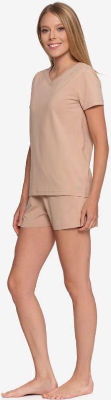 PIŻAMA DAMSKA BAWEŁNIANA Z KRÓTKIM RĘKAWEM I SPODENKAMI MORAJ BEŻOWA S PIŻAMA DAMSKA BAWEŁNIANA Z KRÓTKIM RĘKAWEM I SPODENKAMI MORAJ BEŻOWA S Piżama damska z krótkim rękawem to propozycja, która łączy prostotę, wygodę i subtelny styl. Uszyta z wysokiej jakości bawełny, jest przyjazna dla skóry i zapewnia swobodę ruchów, dzięki czemu świetnie sprawdzi się zarówno podczas snu, jak i leniwych poranków w domu. Klasyczna koszulka z dekoltem w kształcie litery V i krótkim rękawem tworzy zgrany duet z luźnymi spodenkami na elastycznej gumce, które gwarantują pełen komfort noszenia. Piżama jest głównie bez wzoru, natomiast subtelny nadruk na dole koszulki dodaje całości kobiecej lekkości. To ponadczasowy zestaw, który sprawdzi się przez cały rok i stanie się ulubionym elementem domowej garderoby. Naturalna bawełna – delikatna i przewiewna, idealna dla skóry. Komfortowy komplet – koszulka z krótkim rękawem i spodenki. Elastyczna talia w spodenkach – idealne dopasowanie i wygoda. Minimalistyczny kolor z subtelnym nadrukiem. Ponadczasowy motyw – praktyczny, basic i kobiecy zarazem. Skład: 95% bawełna / cotton; 5% elastan / elastane Rozmiar: S