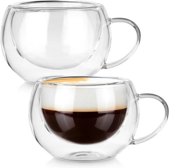 Zestaw dwóch szklanek termicznych z podwójną ścianką, o pojemności 280 ml. Świetnie sprawdzą się do picia kawy lub herbaty. Serwowane w nich napoje prezentują się bardzo efektownie. Zestaw dwóch szklanek termicznych - Zestaw dwóch szklanek termicznych z podwójną ścianką w nowoczesnym designie. Szklanki zapewnią efektowne serwowanie napojów. Każda szklanka ma wymiary 14 x 11 x 8 cm i pojemność 280 ml. Szklane z podwójną szklanką - Wykonane z podwójnego szkła borokrzemowego, które utrzymuje temperaturę napoju przez długi czas. Szkło jest przezroczyste. Ciepłe napoje nie schładzają się szybko, a napoje zimne, pozostają dłużej chłodne. Uniwersalne zastosowanie - Świetnie sprawdzą się do picia kawy lub herbaty. Serwowane w nich napoje prezentują się bardzo efektownie. Odporne na temperaturę - Zaletą szklanek termicznych jest zwiększona odporność na wysokie i niskie temperatury. Szklanki są odporne na temperaturę od -20°C do +100°C. Wygodny uchwyt - Szklanki posiadają modny design. Wyposażone w wygodny uchwyt, który zapewni wygodne użytkowanie. Szklanki mimo podwójnej ścianki są lekkie. Komplet dwóch szklanek termicznych z podwójną ścianką. Szklanki mają nowoczesny design. Dzięki podwójnej ściance gorące napoje nie będą nas parzyły w ręce i szklanki pozwolą na utrzymanie dłużej ciepłej temperatury, to samo dotyczy chłodnych napojów. Idealne do picia ulubionej kawy, herbaty i innych napojów. Szklanki są świetnym pomysłem na prezent. Oryginalny produkt marki Vilde. Wyprodukowano zgodnie z europejskimi standardami. Nie zaleca się myć w zmywarce ze względu na mikrootwór technologiczny, przez który mogą dostać się do przestrzeni między ściankami kropelki wody wtłaczane pod ciśnieniem przez dysze zmywarki.