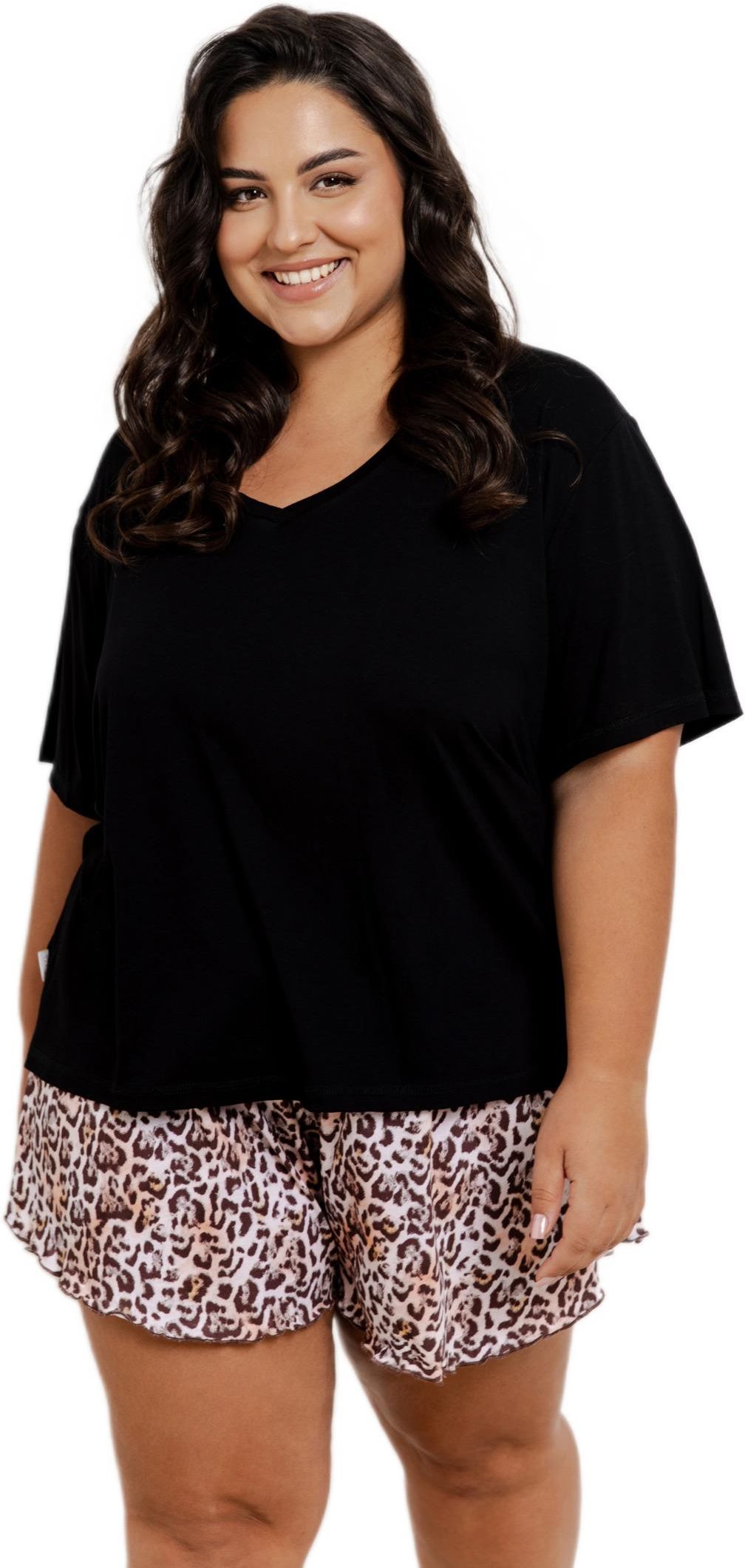 Piżama damska z krótkim rękawem, bluzka jednolita dekolt w serek. Do kompletu krótkie spodenki w panterke. Skład: bluzka 94% Wiskoza, 6% Elastan, spodnie 100% Bawełna