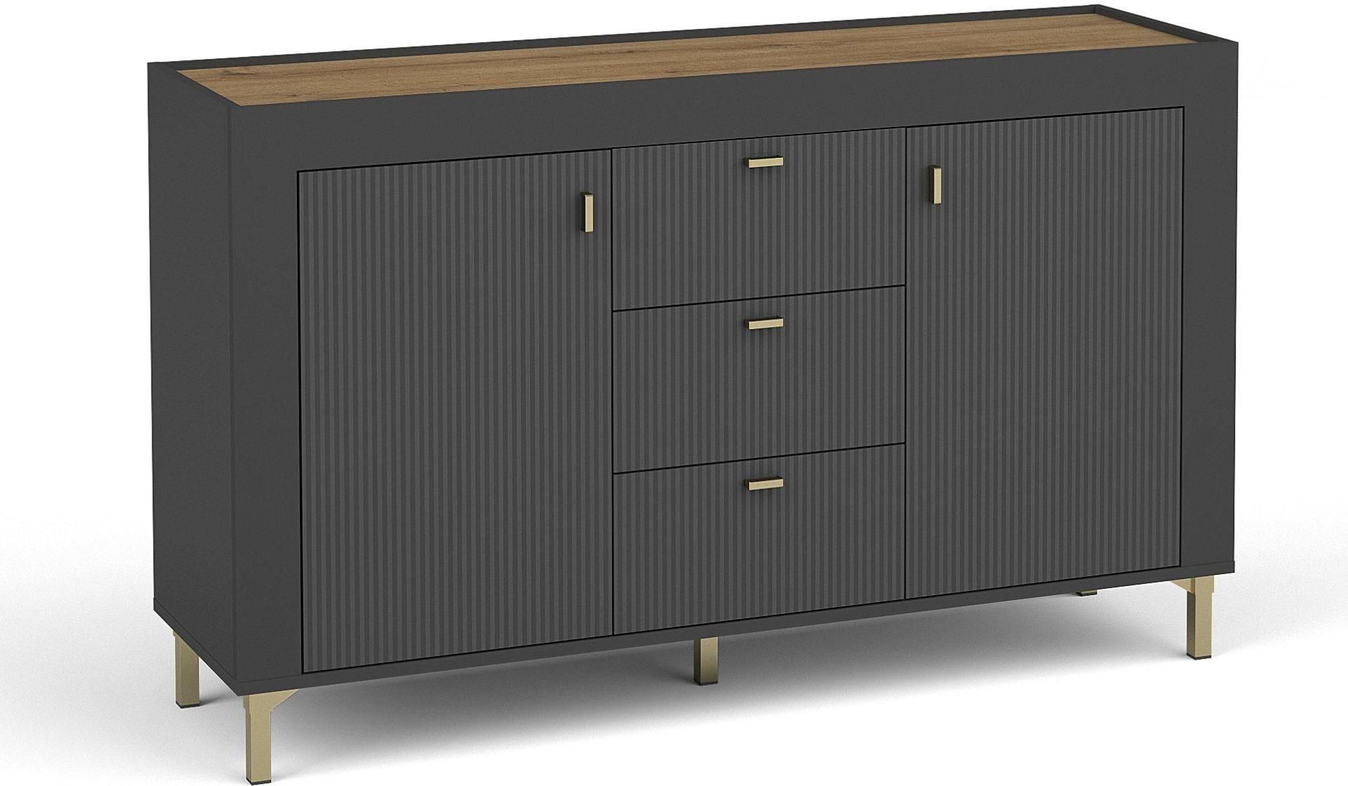 Komoda z szufladami i szafkami z kolekcji Mossa MO6 wpisuje się w aktualne trendy wnętrzarskie.Mebel świetnie sprawdzi się w salonie, pokoju młodzieżowym lub sypialni.Komoda wykonana jest z wysokiej jakości płyty meblowej, która zapewni trwałość na długi czas.Czarny kolor mebla z blatem w kolorze dąb whisky ociepli wnętrze i doda mu przytulności.Nóżki z tworzywa sztucznego w kolorze złotym dodają meblowi lekkości i ułatwiają utrzymanie porządku.Złote uchwyty i ryflowane fronty uzupełniają całość i dodają subtelności.Komoda MO6 jest elementem większej kolekcji Mossa, co pozwala na aranżację wnętrza wg własnych potrzeb.Mebel dostarczany jest w paczkach do samodzielnego montażu według dołączonej instrukcji.Wymiary:Produkt objęty jest 2-letnią gwarancją.Produkt dostarczymy do Państwa BEZPŁATNIE pod wskazany adres na terenie całego kraju.Co WAŻNE: zgodnie z prawem i naszymregulaminemmają Państwo pełne prawo do zwrotu nieużywanych towarów, jeśli nie spełnią one Państwa oczekiwań.