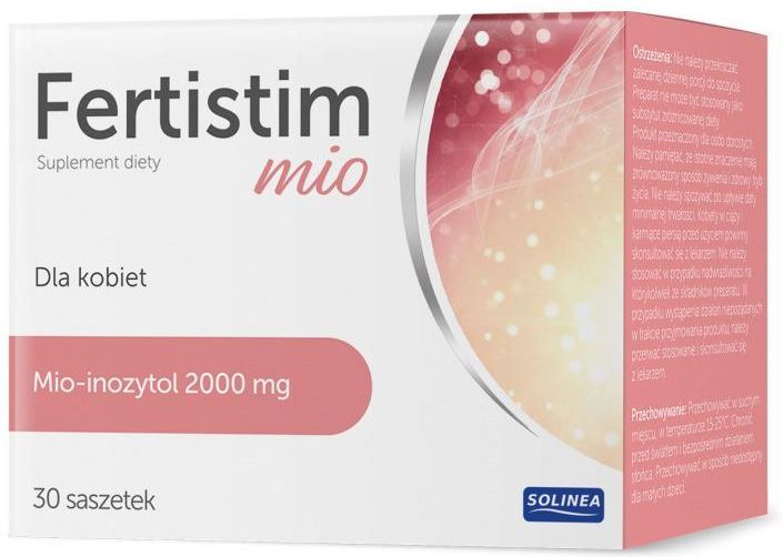 Fertistim Mio 30 saszetek to produkt przeznaczony dla osób dorosłych, którego zadaniem jest uzupełnianie codziennej diety w mio-inozytol. Preparat ma postać proszku zamkniętego w pojedynczych saszetkach. Zalecana porcja do spożycia to jedna lub dwie Fertistim Mio saszetki dziennie, w zależności od indywidualnych potrzeb. Zawartość saszetki należy rozpuścić w wodzie i wymieszać. Proszek można także dodać do jogurtu, soku lub smoothie. Fertistim Mio 30 saszetek może być stosowany jako uzupełnienie zbilansowanej diety i zdrowego stylu życia, które są istotnym elementem prawidłowego funkcjonowania organizmu.
