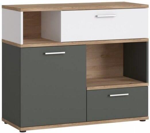 Twenty TWEK01 - Komoda 1D2S Dąb Honey Castello/Biała/Szara Komoda Twenty TWEK01 łączy nowoczesny design z funkcjonalnością, oferując pojemne szuflady i ukrytą przestrzeń za drzwiami. Kontrastowe kolory Dąb Honey Castello, Biały Alpejski i Szary Grafit dodają elegancji. Wymiary: Szerokość (cm): 100 …
