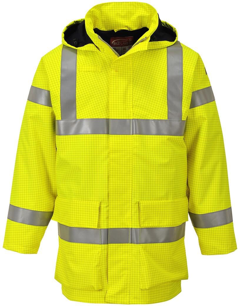 Przeciwdeszczowa kurtka robocza ostrzegawcza Portwest Bizflame Multi Lite S774, kolor żółty, lekka, funkcjonalna i trudnopalna, bez ocieplenia. Wykonana z oddychającego materiału, odprowadzającego wilgoć. Trudnopalna podszewka bawełniana oraz naszyta taśma ostrzegawcza klasy Premium chronią przed ograniczonym płomieniem rozprzestrzeniającym się po kontakcie krótkotrwałym. Ocieplające, dzianinowe mankiety zapewniają ciepło i komfort użytkowania. Kurtka wyposażona jest w wewnętrzną kieszeń na klatce piersiowej, ukrytą kieszeń na telefon oraz w pętlę umożliwiającą przyczepienie krótkofalówki. Dodatkowo posiada właściwości antystatyczne. Zewnętrzna naszywka z normami znacznie ułatwia identyfikację odzieży. Naszyte odblaskowe taśmy umożliwiają rozpoznawanie kształtu ludzkiej sylwetki z odległości. Dodatkowym atutem jest dwustronny zamek błyskawiczny oraz składany kaptur. Zastosowanie: Przemysł transportowy Prace budowlane Przemysł energetyczny Lotniska Prace drogowe Odpowiednia do prac na świeżym powietrzu w zmiennych warunkach pogodowych Materiał: 98% Poliester, 2% Włókno węglowe, Oddychające powleczenie PU Podszewka: 100% Bawełna, wykończenie trudnopalne Dostępne rozmiary: S – 5XL Normy i certyfikaty: EN ISO 14116 | EN 1149 -5 | EN 13034 | EN ISO 20471 | EN 343