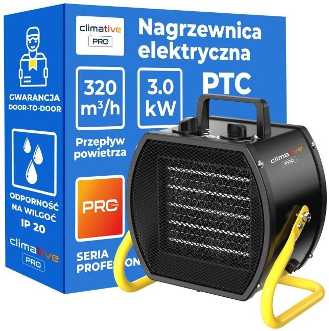 Nagrzewnica elektryczna Climative PTC EHP-3 PRO 🔵 Moc 3,0 kW – efektywnie ogrzewa pomieszczenia do 30 m², idealna do biura, garażu lub domku letniskowego. 🔵 Przepływ powietrza 320 m³/h – zapewnia szybkie i równomierne rozprowadzenie ciepła w całym wnętrzu. 🔵 Nowoczesna grzałka PTC – natychmiastowe ciepło po uruchomieniu, bez strat energii i z pełnym bezpieczeństwem użytkowania. 🔵 Trzy poziomy pracy – możliwość wyboru pomiędzy samą wentylacją, trybem ekonomicznym 1,5 kW lub pełną mocą 3,0 kW. 🔵 Wbudowany termostat – automatycznie utrzymuje komfortową temperaturę i zmniejsza zużycie energii. 🔵 Zabezpieczenie przed przegrzaniem – gwarantuje bezpieczną pracę nawet przy długim czasie użytkowania. 🔵 Stabilna konstrukcja z nóżkami – pewne ustawienie na każdej powierzchni, bez ryzyka przewrócenia. 🔵 Seria PRO – metalowa obudowa zapewnia trwałość, odporność i pełne bezpieczeństwo pracy. Nagrzewnica PRO – Wydajność, Trwałość i Komfort Użytkowania 🔵 Intuicyjne sterowanie – wygodne pokrętło umożliwia szybki wybór trybu pracy: sam wentylator, 1,5 kW lub pełna moc 3,0 kW. 🔵 Wytrzymała kratka wylotowa – chroni grzałkę PTC i kieruje równomierny strumień ciepłego powietrza, gwarantując bezpieczeństwo użytkowania. 🔵 Metalowa obudowa PRO – solidna i odporna na wysokie temperatury, zapewnia trwałość oraz stabilną pracę nawet przy intensywnej eksploatacji. 🔵 Stabilne nóżki – zapewniają pewne ustawienie urządzenia na każdej powierzchni, także śliskiej, bez ryzyka przewrócenia. 🔵 Uchwyt transportowy z możliwością demontażu – ułatwia przenoszenie i przechowywanie nagrzewnicy, gdy nie jest używana. Bezpieczne i nowoczesne ogrzewanie 🔵 Natychmiastowe ciepło – element grzewczy PTC zaczyna działać od pierwszej sekundy, bez konieczności rozgrzewania spirali. 🔵 Bezpieczna praca – grzałka automatycznie ogranicza pobór energii po osiągnięciu zadanej temperatury, chroniąc urządzenie przed przegrzaniem. 🔵 Energooszczędność – PTC pobiera wyłącznie tyle energii, ile jest potrzebne do utrzymania ciepła, co realnie obniża koszty eksploatacji. 🔵 Komfort bez zapachu spalenizny – powietrze ogrzewane jest równomiernie i delikatnie, bez nieprzyjemnego zapachu typowego dla klasycznych farelek. 🔵 Wysoka trwałość – elementy PTC są odporne na zużycie i przystosowane do długotrwałej, intensywnej pracy przez wiele sezonów. 🔵 Technologia klasy PRO – rozwiązanie stosowane w profesjonalnych nagrzewnicach, stworzone do niezawodnego działania w wymagających warunkach. Bezpieczne ciepło w każdych warunkach 🔵 Wbudowany termostat – automatycznie kontroluje pracę nagrzewnicy, utrzymując stabilną temperaturę i zapobiegając przegrzewaniu powietrza. 🔵 Podwójny system ochrony – połączenie regulacji temperatury z dodatkowym zabezpieczeniem odcinającym zasilanie przy przegrzaniu gwarantuje pełne bezpieczeństwo użytkowania. 🔵 Stopień ochrony IP20 – przeznaczona do bezpiecznego stosowania w domach, biurach, warsztatach oraz innych suchych pomieszczeniach. 🔵 Przewód zasilający 100 cm – zapewnia wygodne i stabilne podłączenie, umożliwiając swobodną pracę urządzenia. 🔵 Stabilna konstrukcja i metalowa obudowa PRO – trwała, odporna na uszkodzenia i zaprojektowana do wieloletniej, intensywnej eksploatacji.