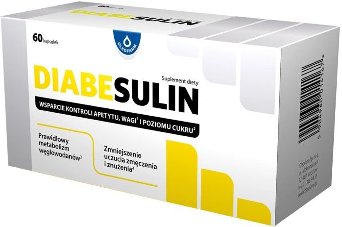 Oleofarm Diabesulin 60 kapsułek to suplement diety, który zawiera połączenie składników roślinnych oraz witamin i minerałów. W jego składzie znajduje się ekstrakt z liści morwy białej, ekstrakt z liści gurmaru oraz ekstrakt z nasion kozieradki. Morwa biała pomaga utrzymać prawidłowy poziom glukozy we krwi, gurmar może przyczyniać się do zmniejszenia apetytu i ograniczenia podjadania, a kozieradka wspiera metabolizm tłuszczów. Diabesulin kapsułki zawierają także witaminy B6 i B12 oraz chrom. Suplement diety dedykowany jest osobom dorosłym. Oleofarm Diabesulin 60 kapsułek zaleca się przyjmować przed śniadaniem i obiadem.