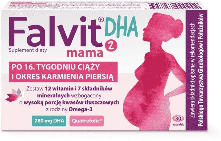 Falvit® mama 2 DHA dla kobiet po 16. tygodniu ciąży i karmiących, 30 kapsułek  Falvit® mama 2 DHA to suplement diety przeznaczony dla kobiet po 16. tygodniu ciąży oraz w okresie karmienia piersią. Zestaw 12 witamin i 7 składników mineralnych wzbogacony o wysoką porcję kwasów tłuszczowych z rodziny Omega-3 – DHA, który uzupełnia zwiększone zapotrzebowanie organizmu kobiety na składniki odżywcze. Zawiera m.in. składniki opisane w rekomendacjach Polskiego Towarzystwa Ginekologów i Położników, czyli DHA, żelazo, jod, kwas foliowy i witaminę D. Wystarczy tylko 1 mała kapsułka dziennie. Właściwości: Falvit® mama 2 DHA to suplement diety dla kobiet po 16. tygodniu ciąży i matek karmiących piersią, który dostarcza najważniejsze witaminy i składniki mineralne, wspierające zdrowie mamy* i dziecka**. Falvit® mama 2 DHA uzupełnia dietę w te składniki, których dostarczenie z dietą może być trudne lub niewystarczające. Zawiera 12 witamin i 7 składników mineralnych oraz DHA, w tym składniki opisane w rekomendacjach Polskiego Towarzystwa Ginekologów i Położników: 280 mg DHA - kwas tłuszczowy z rodziny Omega-3. Spożywanie kwasu dokozaheksaenowego (DHA) przez matkę wspomaga prawidłowy rozwój oczu u płodu i niemowląt karmionych piersią*. DHA przyczynia się do utrzymania prawidłowego funkcjonowania mózgu**. 28 mg żelaza elementarnego - pomaga w prawidłowej produkcji czerwonych krwinek i hemoglobiny, w prawidłowym transporcie tlenu w organizmie oraz odgrywa rolę w procesie podziału komórek.  W Falvit mama 2 DHA zastosowano opatentowaną formę żelaza elementarnego - Ferronyl™ w postaci mikronizowanej, drobno rozproszonej dla poprawy rozpuszczalności i wchłaniania. 800 µg aktywnego kwasu foliowego – przyczynia się do wzrostu tkanek matczynych w czasie ciąży. W Falvit mama 2 DHA zastosowano 800 µg Quatrefolic® - nowoczesną, opatentowaną formę aktywnego kwasu foliowego, o dobrej biodostępności, gotową do bezpośredniego wykorzystania przez organizm.  200 µg jodu - pomaga w prawidłowym funkcjonowaniu układu nerwowego oraz w prawidłowej produkcji hormonów tarczycy i jej prawidłowym funkcjonowaniu. 10 µg witaminy D – pomaga w utrzymaniu zdrowych kości i zdrowych zębów, w prawidłowym funkcjonowaniu układu odpornościowego, w prawidłowym wchłanianiu i wykorzystaniu wapnia i fosforu oraz w prawidłowym funkcjonowaniu mięśni. * Kwas dokozaheksaenowy (DHA) przyczynia się do utrzymania prawidłowego funkcjonowania mózgu. ** Spożywanie kwasu dokozaheksaenowego (DHA) przez matkę wspomaga prawidłowy rozwój oczu u płodu i niemowląt karmionych piersią. Zawartość substancji odżywczych w 1 kapsułce Falvit® mama 2 DHA suplement diety:  Substancja Zawartość RWS* Witamina C 100 mg 125% Niacyna (witamina B3) 19 mg 119% Witamina E 15 mg 125% Kwas pantotenowy (witamina B5) 10 mg 167% Ryboflawina (witamina B2) 1,8 mg 129% Witamina B6 2,2 mg 157% Tiamina (witamina B1) 1,55 mg 141% Witamina A 500 µg 63% Kwas foliowy 800 µg 400% Witamina D 10 µg 200% Witamina B12 4 µg 160% Biotyna (witamina B7) 200 µg 400% Magnez 55,26 mg 15% Żelazo 28 mg 200% Cynk 10 mg 100% Mangan 1 mg 50% Miedź 1 mg 100% Jod 200 µg 133% Selen 55 µg 100% Olej rybi, w tym: Kwas dokozaheksaenowy (DHA), Kwas eikozapentaenowy (EPA) 400 mg 280 mg 46 mg   - * Referencyjne Wartości Spożycia Składniki: olej rybi zawierający kwas dokozaheksaenowy (DHA) oraz kwas eikozapentaenowy (EPA); żelatyna wołowa (kapsułka); L-askorbinian wapnia (witamina C); tlenek magnezu (magnez); substancja utrzymująca wilgoć: glicerol; żelazo elementarne (żelazo); substancja zagęszczająca: wosk pszczeli; D-alfa-tokoferol (witamina E); amid kwasu nikotynowego (niacyna); tlenek cynku (cynk); D-pantotenian wapnia (kwas pantotenowy); betakaroten (witamina A); cyjanokobalamina (witamina B12); siarczan manganu (mangan); chlorowodorek pirydoksyny (witamina B6); siarczan miedzi (II)(miedź); barwniki: tlenki i wodorotlenki żelaza; ryboflawina (witamina B2); monoazotan tiaminy (tiamina); sól glukozaminowa kwasu (6S)-5-metylotetrahydrofoliowego (kwas foliowy) (Quatrefolic®); cholekalcyferol (witamina D); jodek potasu (jod); D-biotyna (biotyna); selenian (IV) sodu (selen). Zalecane dzienne spożycie: 1 kapsułka podczas posiłku lub bezpośrednio po nim. Nie należy przekraczać zalecanej porcji do spożycia w ciągu dnia.  Bezpieczeństwo stosowania: Prowadzenie zdrowego trybu życia i stosowanie zrównoważonej diety są niezbędne dla zachowania dobrego stanu zdrowia. Suplementy diety nie mogą być stosowane jako substytut (zamiennik) zróżnicowanej diety. Produkt dla kobiet w ciąży, stosować po konsultacji z lekarzem. Przed zastosowaniem produktów zawierających żelazo wskazane jest wykonanie badania poziomu ferrytyny we krwi oraz konsultacja wyniku z lekarzem. Przechowywanie:  Przechowywać w szczelnie zamkniętym opakowaniu, w temperaturze miedzy 15-25°C, w sposób niedostępny dla małych dzieci. Chronić przed światłem. Podmiot odpowiedzialny za informacje o produkcie: Bausch Health Poland sp. z o.o.,  ul. Przemysłowa 2 35-105 Rzeszów Producent: Laboratorios Liconsa, S.A. Avenida De Miralcampo, 7, Polígono Industrial Miralcampo, 19200 Azuqueca de Henares, Hiszpania Suplement diety nie może być stosowany jako substytut zróżnicowanej diety. Zrównoważony sposób odżywiania i zdrowy tryb życia są istotne dla prawidłowego funkcjonowania organizmu. Przechowywać w temperaturze pokojowej, w sposób niedostępny dla małych dzieci.