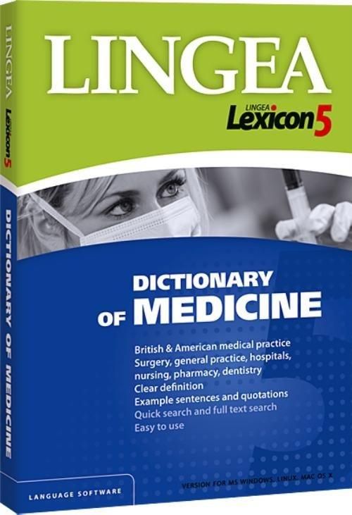 Angielski słownik medyczny składa się z ponad 12 500 haseł z zakresu medycyny. Zawiera brytyjskie i amerykańskie terminy z zakresu medycyny ogólnej, chirurgii, ortopedii, stomatologii i innych specjalizacji medycznych. Dictionary of Medicine Obejmuje terminy fachowe i techniczne oraz wyrazy potoczne, których używają zarówno specjaliści jak i pacjenci. Objaśnienia poszczególnych pojęć napisane są prostym i zrozumiałym językiem angielskim. Hasła zawierają przykłady demonstrujące sposób ich zastosowania, cytaty z czasopism fachowych, notki encyklopedyczne oraz określenia części mowy. Słownik jest przydatny dla studentów medycyny i dyscyplin pokrewnych oraz specjalistów uczących się medycznego języka angielskiego. Tłumaczenia wyświetlane są bardzo przejrzyście - kolorami zostały wyróżnione hasła główne, części mowy, rodzaje gramatyczne, przykłady rekcji czasowników, oraz uwagi gramatyczne. Słownik podaje czasowniki złożone, kolokacje, idiomy, przykłady, rejestry językowe oraz regionalizmy. Dla większej wygody, wszystkie powyższe informacje są wyróżnione czcionką i odpowiednio dobranymi kolorami. W lewym oknie programu są wyświetlane odsyłacze do słów powiązanych z hasłem głównym, na przykład czasowniki złożone czy kolokacje. Pozwala to nam na poszerzenie słownictwa i znalezienie najbardziej odpowiedniego tłumaczenia. Program wyświetla również przykłady, w których pojawiło się szukane słowo, w treści innych haseł. W ten sposób można dowiedzieć się, w jaki sposób szukanego wyrazu można użyć w połączeniu z innymi słowami. Oprócz standardowego hasła, program Lexicon pokazuje również przykłady użycia danego słowa w kontekstach czy kolokacjach. Dzięki temu można łatwiej opanować sposób użycia danego słowa w kontekście zdania. Lexicon umożliwia wyszukiwanie słów z użyciem znaków specjalnych – np. znak * umożliwia zastąpienie dowolnych liter w wyszukiwanym słowie – słownik wyszuka najbardziej odpowiednie wyrazy. Najwygodniejszym i najłatwiejszym sposobem wyszukiwania jest wykorzystanie funkcji mouse-over. Wystarczy tylko najechać kursorem na nieznany wyraz znajdujący się w oknie innego programu, a w oknie słownika od razu pokaże się jego tłumaczenie. Lexicon współpracuje m. in. z takimi znanymi aplikacjami MS Word, Internet Explorer, Mozilla Firefox, Adobe Acrobat oraz GaduGadu. Zalecana konfiguracja System operacyjny: MS Windows 98/2000/XP/Vista Karta dźwiękowa, CD-ROM