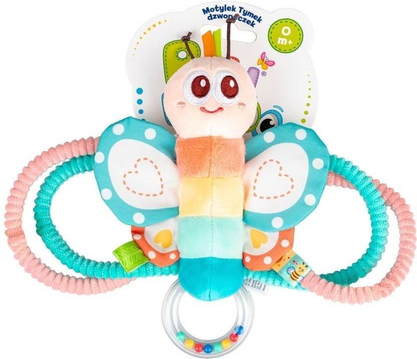 Tymek, szeleszcząc wesoło, zaprasza do sensorycznej zabawy! Kolorowy motylek wyposażony został w kryty dzwoneczek, który wydaje uroczy dźwięk przy każdym potrząśnięciu zabawką. Kolorowe, fakturowane obręcze, które zdobią Tymka są elastyczne i dostosowane do małych rączek, co ułatwia najmłodszym chwytanie zabawki. Jakby tego było mało, Motylek posiada także grzechoczący element, a jest nim przezroczysty krążek, wypełniony koralikami. Zabawka uszyta została z materiałów o zróżnicowanych fakturach, co pozwala rozwijać zdolności poznawcze malucha, zachęcając go do odkrywania świata za pomocą zmysłów. Produkt przeznaczony jest dla dzieci od dnia narodzin. Cechy produktu: dzwoneczek; elastyczne, fakturowane obręcze; materiałowe metki; szeleszczące skrzydełka; zróżnicowane faktury materiałów; grzechotka (kółko z kolorowymi koralikami); wiek: 0m+. EAN: 6925783826163