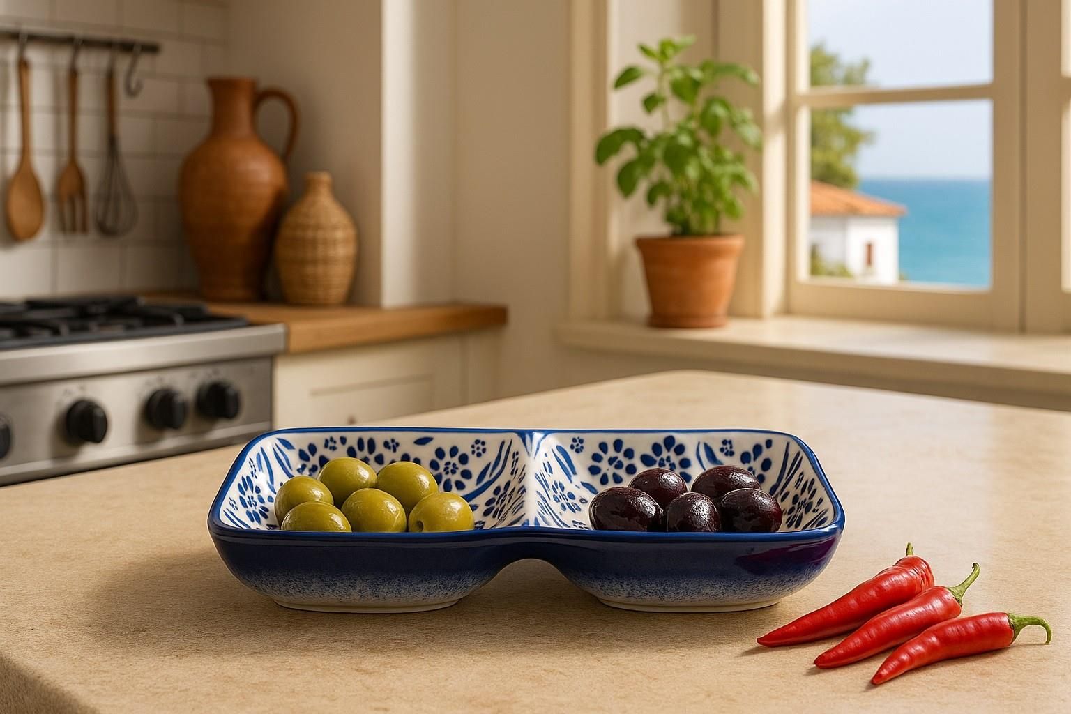 Ceramiczny dip podwójny 17,5 cm White/Dark Blue Na jego powierzchni rozwija się misterna kompozycja niczym ogródek w miniaturze – drobne kwiaty, liście i wijące się ornamenty układają się w harmonijną, rytmiczną mandalę. Głębokie granatowe linie kontrastują z jasnym tłem, tworząc efekt przypominający tradycyjne tureckie zdobienia znane z ceramicznych kafli i tekstyliów. Wzór ma w sobie coś z tańca roślinnych motywów, a jednocześnie porządek geometrycznej symetrii, która wciąga spojrzenie ku centrum naczynia. To nie tylko zastawa stołowa – to zaproszenie do podróży, smaków i chwil dzielonych z bliskimi. Salaterka/dip staje się nie tyle naczyniem, co centrum spotkania – takiego, które pamięta się długo, bo łączy w sobie prostotę codzienności i odrobinę orientalnej magii. Ten podwójny dip łączy w sobie elegancję tradycyjnego rękodzieła z wyjątkowym efektem dekoracyjnym. Jego powierzchnia zdobiona jest klasycznym, kontrastowym wzorem w odcieniach granatu i bieli, a dodatkowego uroku nadaje jej zjawisko krakle – drobne spękania szkliwa widoczne na powierzchni. Efekt krakle – piękno niedoskonałości Spękania, które zauważysz na powierzchni naczynia, to nie wada, lecz celowy rezultat procesu produkcji. Powstają one wskutek różnic w pracy szkliwa i masy ceramicznej podczas wypału. Czasami sieć drobnych spękań ujawnia się od razu, a czasem dopiero z upływem czasu lub po wlaniu bardzo gorących płynów. To naturalne zjawisko, nadające każdemu egzemplarzowi indywidualny charakter – żaden nie jest identyczny. Tradycja i rzemiosło Efekt krakle ceniony jest w ceramice od stuleci – już w dawnej Azji traktowano go jako wyraz szlachetności i unikatowości wyrobu. Współcześnie stosuje się go głównie w ceramice dekoracyjnej, by nadać naczyniom wrażenie autentyczności i subtelnego postarzenia. Ważna informacja dla Klienta!!! Spękania pod szkliwem są zamierzonym elementem dekoracyjnym, charakterystycznym dla tego rodzaju ceramiki. Nie obniżają jakości ani trwałości produktu, a wręcz podkreślają jego rzemieślniczy charakter. Polecamy razem Uzupełnij swój dip 17,5 cm o inne elementy z tej kolekcji i stwórz wyjątkową, spójną zastawę stołową: Talerze deserowe – idealne na ciasta, owoce i drobne przekąski. Półmiski i miski – na pieczywo, przystawki i świeże sałatki. Kubki – do aromatycznej herbaty lub kawy, z tym samym eleganckim ornamentem Dzbanek – praktyczny i ozdobny, świetnie komponuje się z kubkami. Razem tworzą harmonię granatu i bieli, która przeniesie Twoje posiłki w klimat orientalnej uczty. Zdjęcie aranżacyjne ma charakter poglądowy. Prezentowana aranżacja może zawierać elementy dekoracyjne niewchodzące w skład zestawu. Szczegóły dotyczące zawartości znajdują się w opisie produktu.