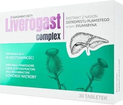 Opis: Liverogast Complex to suplement diety zawierający w swoim składzie ekstrakt z nasion ostropestu plamistego. Produkt przeznaczony dla osób dorosłych.. Opis: Liverogast Complex to suplement diety zawierający w swoim składzie ekstrakt z nasion ostropestu plamistego. Produkt przeznaczony dla osób dorosłych.. Składniki: Substancja wypełniająca - węglan wapnia, ekstrakt z nasion ostropestu plamistego (Silybum marianum L.), substancja wypełniająca – celuloza mikrokrystaliczna, maltodekstryna, substancje przeciwzbrylające: sól sodowa karboksymetylocelulozy usieciowana, substancje glazurujące: hydroksypropylometyloceluloza, alkohol poliwinylowy, glikol polietylenowy; barwnik – talk, substancje przeciwzbrylające: dwutlenek krzemu, sole magnezowe kwasów tłuszczowych. Składniki 1 tabletka Ekstrakt z nasion ostropestu plamistego, w tym sylimaryna 87,5 mg 70 mg . Masa netto: 12,9 g. Zalecane dzienne spożycie: Dorośli: 1 tabletka dziennie. Spożywać popijając wodą.. Ostrzeżenia dotyczące bezpieczeństwa: Nie należy przekraczać zalecanej dziennej porcji Suplement diety nie może być stosowany jako substytut (zamiennik) zróżnicowanej diety. Suplement diety jest środkiem spożywczym, którego celem jest uzupełnienie normalnej diety. Suplement diety nie ma właściwości leczniczych. Dla utrzymania prawidłowego stanu zdrowia należy stosować zróżnicowaną dietę i prowadzić zdrowy tryb życia Przechowywać w temperaturze pokojowej Przechowywać w sposób niedostępny dla małych dzieci .