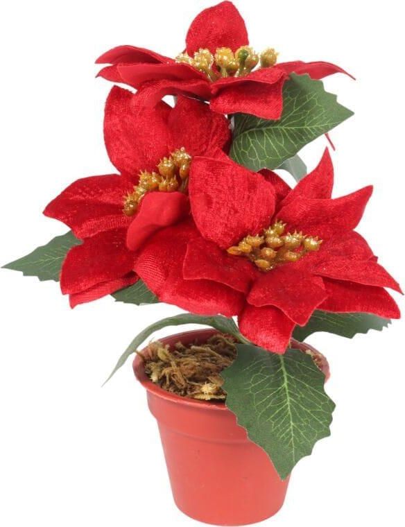 Bukiet sztucznych poinsecji welurowych w doniczce o wysokości 20 cm i średnicy doniczki 7 cm to elegancka dekoracja, która wprowadza do wnętrza świąteczny i przytulny klimat. Wysokiej jakości materiały sprawiają, że kwiaty do złudzenia przypominają żywe rośliny, a staranne wykończenie nadaje im naturalny i efektowny wygląd. Bukiet doskonale sprawdzi się jako samodzielna ozdoba na stole, parapecie, komodzie lub biurku, a także w większych kompozycjach florystycznych, stroikach i dekoracjach bożonarodzeniowych. Dzięki kompaktowym wymiarom i lekkiej konstrukcji łatwo go ustawić w dowolnym miejscu, wprowadzając subtelny akcent elegancji i świątecznego uroku. To ponadczasowa dekoracja, którą można wykorzystywać co roku, a jej uniwersalny charakter sprawia, że jest także świetnym pomysłem na prezent świąteczny.