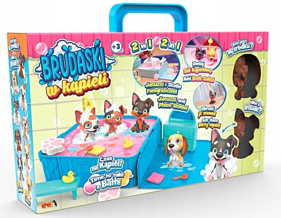 BRUDASKI W KĄPIELI ZESTAW JACUZZI SPA 2 PIESKI + BŁOTKO + 5 AKCESORÓW EPEE 60150 Brudaski w Kąpieli - Zestaw Jacuzzi - 2 pieski + błoto + 5 akcesoriów Kolekcja Brudaski w kąpieli to urocze pieski, które zapewnią niekończącą się zabawę w brudzenie i mycie! Te wyjątkowe zabawki są stworzone, aby dostarczyć radość dzieciom, które uwielbiają kreatywną i prostą zabawę. Każdego pieska można brudzić specjalnym błotkiem, a następnie umyć pod wodą, ciesząc się czystością i świeżością. Kąpiele z Brudaskami to prawdziwa frajda, zwłaszcza dzięki dołączonym aż pięciu akcesoriom, które urozmaicą każdą kąpiel. Każdy Zestaw Jacuzzi z linii Brudaski w kąpieli pozwala dzieciom na wielogodzinną zabawę, która rozwija wyobraźnię i umiejętności manualne. Ten bogaty zestaw zawiera jacuzzi oraz studio fotograficzne, dzięki czemu zabawa Brudaskami w kąpieli może być jeszcze bardzie zajmująca. Te wspaniałe pieski będą świetnym towarzyszem podczas kąpieli, ucząc jednocześnie dbania o czystość i higienę w sposób zabawny i angażujący. Zestaw Jacuzzi z linii Brudaski w kąpieli dostępny jest w poręcznym opakowaniu, które ułatwia transport i utrzymanie porządku. Zawartość opakowania • 2 pieski (LOSOWE) • tubka z błotkiem • Jacuzzi • studio fotograficzne • 5 akcesoriów: kaczuszka, szczotka, ręczniczek, gąbka, sól kąpielowa W asortymencie 9 piesków: beagle, corgi i boston – każdy w 3 innych kolorach