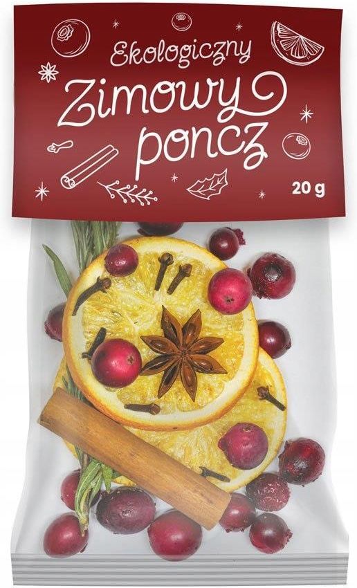 DARY NATURY EKO Zimowy poncz Ekologiczna Herbatka liofilizowana 20 g Rozgrzewająca mieszanka do przygotowania zimowego ponczu lub herbaty. Idealna na chłodne dni, łączy naturalne składniki, takie jak suszone owoce żurawiny i pomarańczy oraz korzenne przyprawy, tworząc harmonijną kompozycję, która otula smakiem. Dzięki tej wyjątkowej mieszance, Twój dom zapełni się zimowym aromatem, a napój dostarczy ciepła w mroźne dni. Co to jest liofilizacja? Liofilizacja to proces suszenia, który polega na usuwaniu wody z zamrożonego surowca przez sublimację, czyli bezpośrednie przejście w stan pary. Dzięki temu procesowi, składniki zachowują swój naturalny wygląd, zapach oraz wartości odżywcze przez długi czas. Dlaczego zioła liofilizowane? Produkty liofilizowane zachowują w 90% swoją strukturę, kolor i aromat. Ponadto, proces suszenia w niskich temperaturach pozwala na zachowanie cennych witamin i olejków eterycznych, co sprawia, że są one wyjątkowo pełne smaku. Składniki pomarańcza*, żurawina*; cynamon*, anyż*, goździki*, rozmaryn*. *produkt rolnictwa ekologicznego Sposób użycia Poncz: do garnka wlej litr soku jabłkowego i 250 ml soku z żurawiny. Dodaj mieszankę i podgrzewaj na małym ogniu przez 10-15 minut, nie doprowadzając do wrzenia. Dopraw do smaku miodem. Napar herbaciany: zawartość torebki dodaj do ulubionej herbaty i zalej w dzbanku gorącą wodą. Parz 10-15 min. Zawartość opakowania 20 g