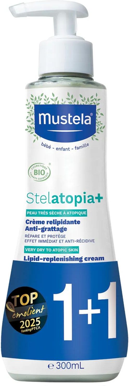 MUSTELA Stelatopia Krem Uzupełniajacy Lipidy - 300ml 300ml DUOPACK 5905794263530 Stelatopia+ – krem uzupełniający lipidy do skóry suchej i atopowej Łagodzi świąd i zaczerwienienia już od pierwszej aplikacji – bezpieczny od 1. dnia życia. Odbudowuje barierę hydrolipidową skóry i długotrwale ją nawilża. Chroni mikrobiom skóry dzięki prebiotykowi Bioécolia®. Wegańska formuła – 99% składników pochodzenia naturalnego. Certyfikowany organiczny produkt, zatwierdzony przez Polskie Towarzystwo Chorób Atopowych (PTCA). Stelatopia+ to specjalistyczny krem do pielęgnacji skóry bardzo suchej, wrażliwej i skłonnej do atopii. Przeznaczony dla niemowląt, dzieci i dorosłych – od 1. dnia życia, również dla wcześniaków (poza oddziałem neonatologicznym). Oparty na naturalnych składnikach aktywnych, redukuje objawy suchości, łagodzi świąd i wspomaga odbudowę bariery ochronnej skóry. Potrójne działanie 1. Łagodzi – natychmiast przynosi ulgę w przypadku świądu i podrażnienia. 2. Odbudowuje – wzmacnia i regeneruje barierę hydrolipidową skóry. 3. Chroni – wspiera równowagę mikrobiomu skóry i zmniejsza nawroty przesuszeń. Efekty stosowania Po 28 dniach regularnego stosowania aż 95% użytkowników deklaruje, że poleciłoby produkt innym. Skóra staje się widocznie ukojona, mniej reaktywna, bardziej miękka i nawilżona. Krem pomaga ograniczyć uporczywe drapanie i zmniejsza ryzyko zaostrzenia zmian atopowych. Przeznaczenie Dla niemowląt, dzieci i dorosłych z bardzo suchą, wrażliwą i skłonną do atopii skórą. Idealny do codziennego stosowania – zarówno w fazie zaostrzenia, jak i w celu podtrzymania remisji. Zastosowanie Nałóż niewielką ilość kremu na czystą i suchą skórę – twarz, ciało lub wybrane miejsca objęte suchością i podrażnieniem. Delikatnie wmasuj, aż do całkowitego wchłonięcia. Stosuj 1–2 razy dziennie lub zgodnie z zaleceniami lekarza. Składniki aktywne Destylat oleju słonecznikowego – certyfikowany organiczny składnik o działaniu łagodzącym i lipidowym, wspiera biosyntezę lipidów. Bioécolia® (prebiotyk) – chroni mikrobiom skóry, wspomaga naturalne mechanizmy obronne naskórka. Olej z awokado – bogaty w kwasy tłuszczowe, nawilża i regeneruje. Masło shea – wygładza, zmiękcza i natłuszcza skórę. Organiczny olej słonecznikowy – wzmacnia barierę skórną, dostarcza cennych lipidów. Bezpieczeństwo i skuteczność Produkt rekomendowany przez Polskie Towarzystwo Chorób Atopowych (PTCA). Przebadany dermatologicznie i pediatrycznie – przeszedł ponad 450 testów jakości i bezpieczeństwa. Wysoka tolerancja – odpowiedni dla skóry wrażliwej, atopowej i niemowlęcej. 92% użytkowników oceniło produkt pozytywnie, a 95% poleciłoby go innym (badania kliniczne). Właściwości Cecha Opis Rodzaj skóry Sucha, bardzo sucha, atopowa – niemowlęca, dziecięca i dorosła Składniki aktywne Destylat oleju słonecznikowego, Bioécolia®, olej z awokado, masło shea Forma Krem uzupełniający lipidy Efekty Łagodzenie świądu, nawilżenie, odbudowa bariery skórnej, ochrona mikrobiomu Marka Mustela Pojemność 2 x 300ml Bezpieczeństwo Od 1. dnia życia, wegańska formuła, 99% składników naturalnych EBE4-714B8