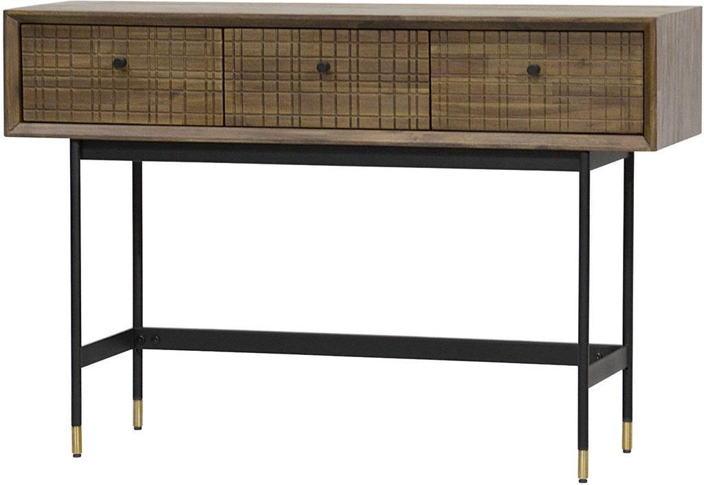 Maze L08 Konsola Kolekcja Maze to nowoczesne meble, charakteryzujące się starannym wykonaniem zarówno prostych formą korpusów, jak i rzeźbionych frontów czy metalowych nóżek zakończonych złotym dekorem. Ponadczasowe połączenie korpusów z naturalnego drewna i czarnych nóżek sprawdzi się w aranżacji każdego wnętrza. Szeroka gama produktów pozwala na wyposażenie sypialni, jadalni, salonu czy przedpokoju nadając pomieszczeniu nowoczesny klimat z nutą stylu retro. Stylowa konsola z trzema szufladami na metalowych nóżkach ze złotymi zakończeniami Wymiary Szerokość (cm): 120 Wysokość (cm): 80 Głębokość (cm): 35 Dane techniczne StylX: Industrialny, Retro MateriałX: Drewno, MDF Materiał: Drewno akacji + mdf Kolor: Jasnobrązowy Wymiary wewnętrzne szuflad: Szerokość- 30 cm, Wysokość- 13 cm, Głębokość- 25 cm Wysokość nóżek: 57 cm Waga (w kg): 28 kg Montaż: Mebel zmontowany przez producenta SzerokośćX: od 101 do 120 cm GłębokośćX: do 40 cm WysokośćX: od 61 do 80 cm