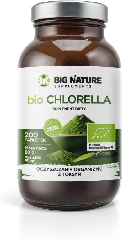 Big Nature Chlorella - suplement diety 200 tab. Bio Producent: Big Nature EAN: 5905745621471 BIO CHLORELLA – SUPLEMENT DIETY dla naturalnej detoksykacji, odporności i codziennej witalności BIO Chlorella to wysokiej jakości suplement diety stworzony z myślą o naturalnym wsparciu codziennego funkcjonowania organizmu. Bogata w chlorofil i cenne składniki odżywcze, chlorella wspiera procesy detoksykacyjne, wzmacnia odporność oraz wspomaga trawienie. Regularne stosowanie pomaga utrzymać energię, witalność i dobre samopoczucie – wszystko w wygodnej, roślinnej formie tabletek. Dlaczego warto wybrać BIO Chlorellę? 100% naturalna, organiczna formułaCzysta, sproszkowana Chlorella pyrenoidosaNaturalne wsparcie detoksykacji i odpornościWegański skład – bez dodatków i sztucznych wypełniaczy Proste dawkowanie – idealne do codziennej rutyny zdrowego stylu życia BIO Chlorella polecana jest dla osób poszukujących naturalnego wsparcia w detoksykacji organizmudbających o odporność i ogólną kondycję organizmuprowadzących aktywny tryb życia i chcących uzupełnić dietę w składniki odżywczestosujących diety roślinne, wegańskie lub wegetariańskienarażonych na stres i zmęczenie, które chcą zadbać o energię i witalność Masa tabletki: 400 mg Składniki bio chlorella pyrenoidosa w proszku Wartości odżywcze: Składnik aktywny 1 tabletka 10 tabletek %RWS* Chlorella (Chlorella pyrenoidosa), proszek 400 mg 4000 mg *RWS – Referencyjna wartość spożyciaSposób przygotowania i przechowywania: Od 2 do 4 tabletek, 3 razy dziennie. Popić dużą ilością wody, najlepiej podczas posiłku lub po nim. Przechowywać w suchym i chłodnym miejscu.Ostrzeżenia i pozostałe informacje: Nie przekraczać zalecanej dziennej dawki. Suplement diety nie zastępuje zróżnicowanej diety. Kobiety w ciąży, karmiące piersią oraz osoby przyjmujące leki powinny skonsultować się z lekarzem przed zastosowaniem. Nie stosować w przypadku nadwrażliwości na którykolwiek ze składników. Informacja alergenna Produkt może zawierać:gluten, gorczycę, orzechy, sezam, seler i soję (ze względu na proces produkcji).