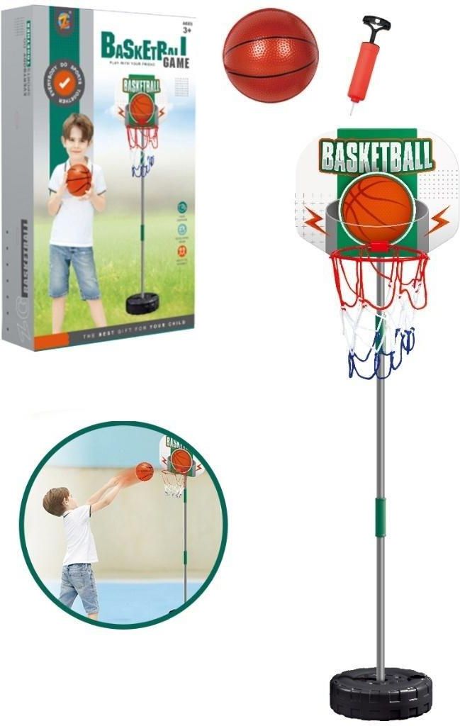 ZESTAW DO GRY W KOSZYKÓWKĘ DUŻA KOSZYKÓWKA TABLICA KOSZ PIŁKA POMPKA Z IGŁĄ Zestaw do Koszykówki dla Dzieci – Mały Koszykarz w Akcji! Zainspiruj swoje dziecko do aktywnej zabawy i rozwijaj jego sportowe umiejętności z naszym zestawem do koszykówki! Idealny dla małych entuzjastów tego dynamicznego sportu, ten zestaw zapewni wiele godzin wspaniałej zabawy zarówno w domu, jak i na świeżym powietrzu. Cechy produktu Kompletny zestaw: Zawiera regulowany stojak z tablicą, obręczą i siatką, piłkę do koszykówki oraz pompkę do piłki. Wszystko, czego Twój mały sportowiec potrzebuje, aby rozpocząć grę! Regulowana wysokość: Stojak posiada możliwość regulacji wysokości, dzięki czemu można go dostosować do wzrostu dziecka, co zapewnia długotrwałą zabawę wraz z jego rozwojem. Stabilna podstawa: Solidna podstawa zapewnia stabilność konstrukcji podczas gry. Można ją dodatkowo obciążyć wodą lub piaskiem, aby zwiększyć stabilność. Łatwy montaż: Zestaw jest prosty w montażu i demontażu, co ułatwia jego przenoszenie i przechowywanie. Bezpieczne materiały: Wykonany z trwałych i bezpiecznych materiałów, idealnych dla dzieci. Aktywna zabawa: Gra w koszykówkę doskonale rozwija koordynację wzrokowo-ruchową, zręczność, celność oraz zachęca do aktywności fizycznej. Zabawa w pojedynkę i w grupie: Zestaw idealnie nadaje się do treningów indywidualnych, jak i do zabaw z przyjaciółmi i rodziną. Atrakcyjny design: Kolorowa tablica z napisem "BASKETBALL" i dynamiczną grafiką przyciąga wzrok i dodaje energii do zabawy.