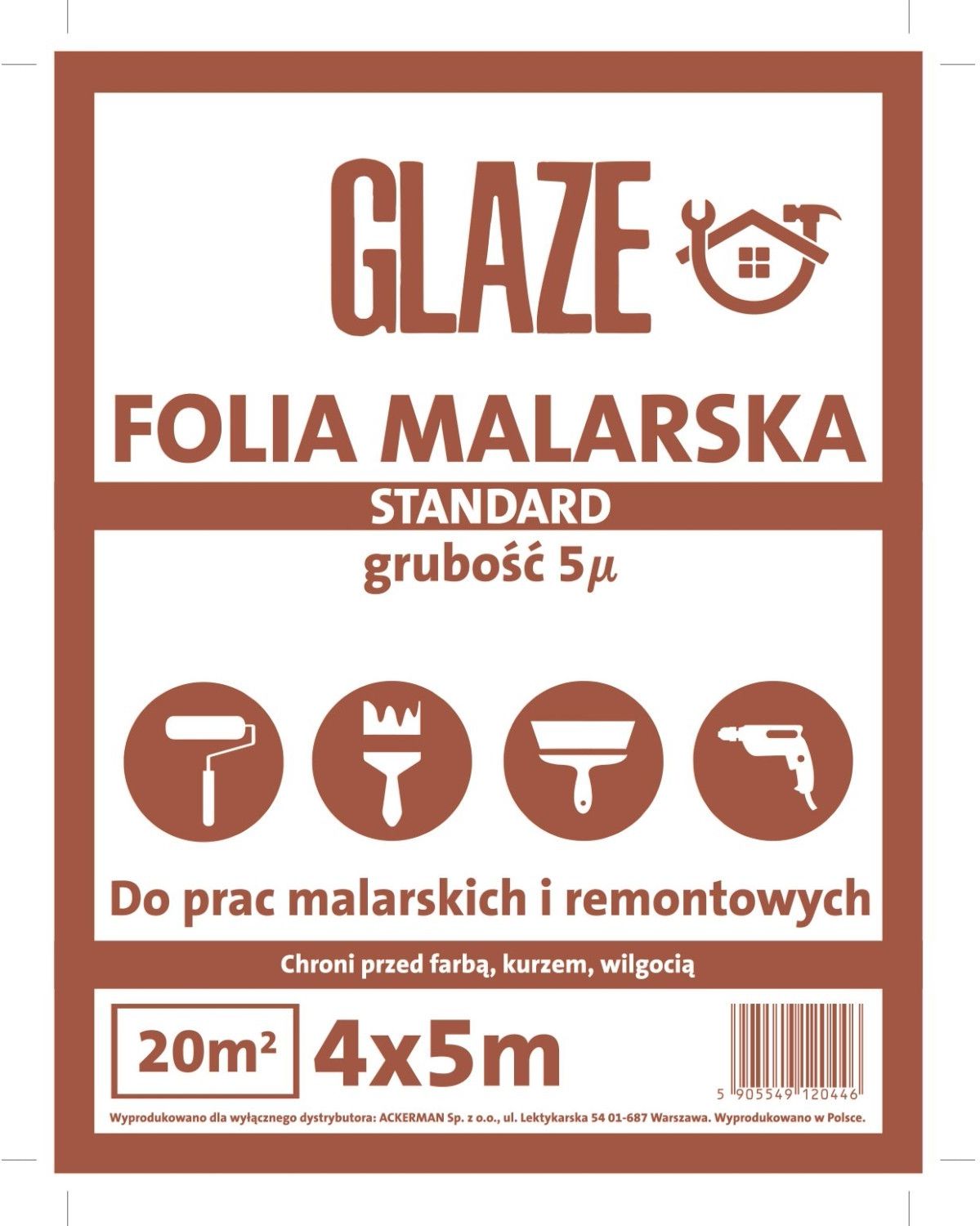Folia Malarska Glaze standard 5 mik. 4 x 5 m Folia malarska jest niezbędna w procesie malowania, tapetowania oraz wykonywania różnych prac remontowych. Chroni podłogi, meble, okna oraz inne powierzchnie przed zabrudzeniami, plamami farby, osiadaniem kurzu i pyłu czy uszkodzeniami podczas prac malarskich. Folia malarska jest łatwa w rozłożeniu i demontażu. Można ją łatwo usunąć, pozostawiając czyste i nienaruszone powierzchnie, dzięki czemu zaoszczędzisz czas i koszty związane z czyszczeniem lub naprawą uszkodzonych powierzchni po zakończeniu prac remontowych. Może być łatwo przycięta do wymaganych rozmiarów i dopasowana do różnych powierzchni, przez co oszczędza czas i wysiłek potrzebny na zabezpieczenie otoczenia przed plamami farby. Folia Standard marki Glaze ma grubośc 5 mik. oraz wymiary 4 x 5 m, co daje aż 20m2 powierzchni do przykrycia elementów wymagających zabezpieczenia.