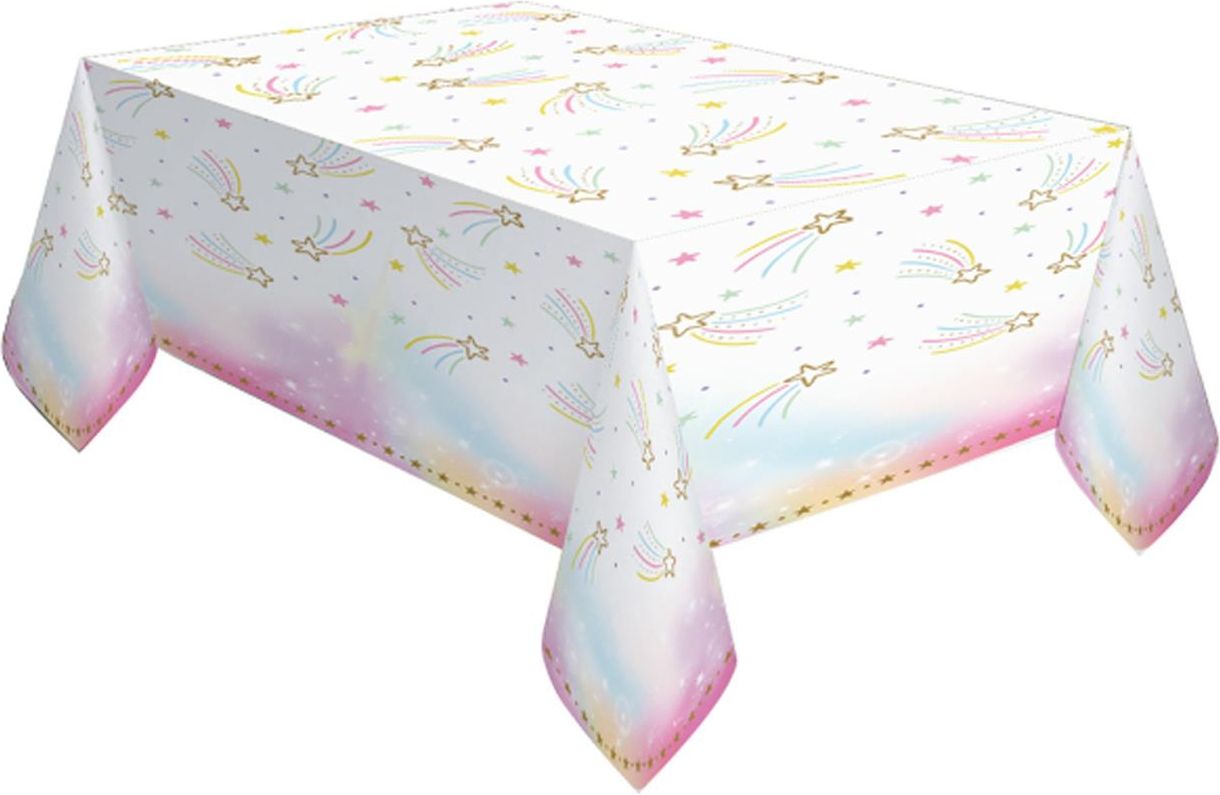 Obrus papierowy z nadrukiem spadających gwiazdek. Obrus pasuje do zestawu Jednorożec, idealny na urodziny dla dziecka. Wymiary: 120 x 180 cm. Opakowanie: 1 szt.