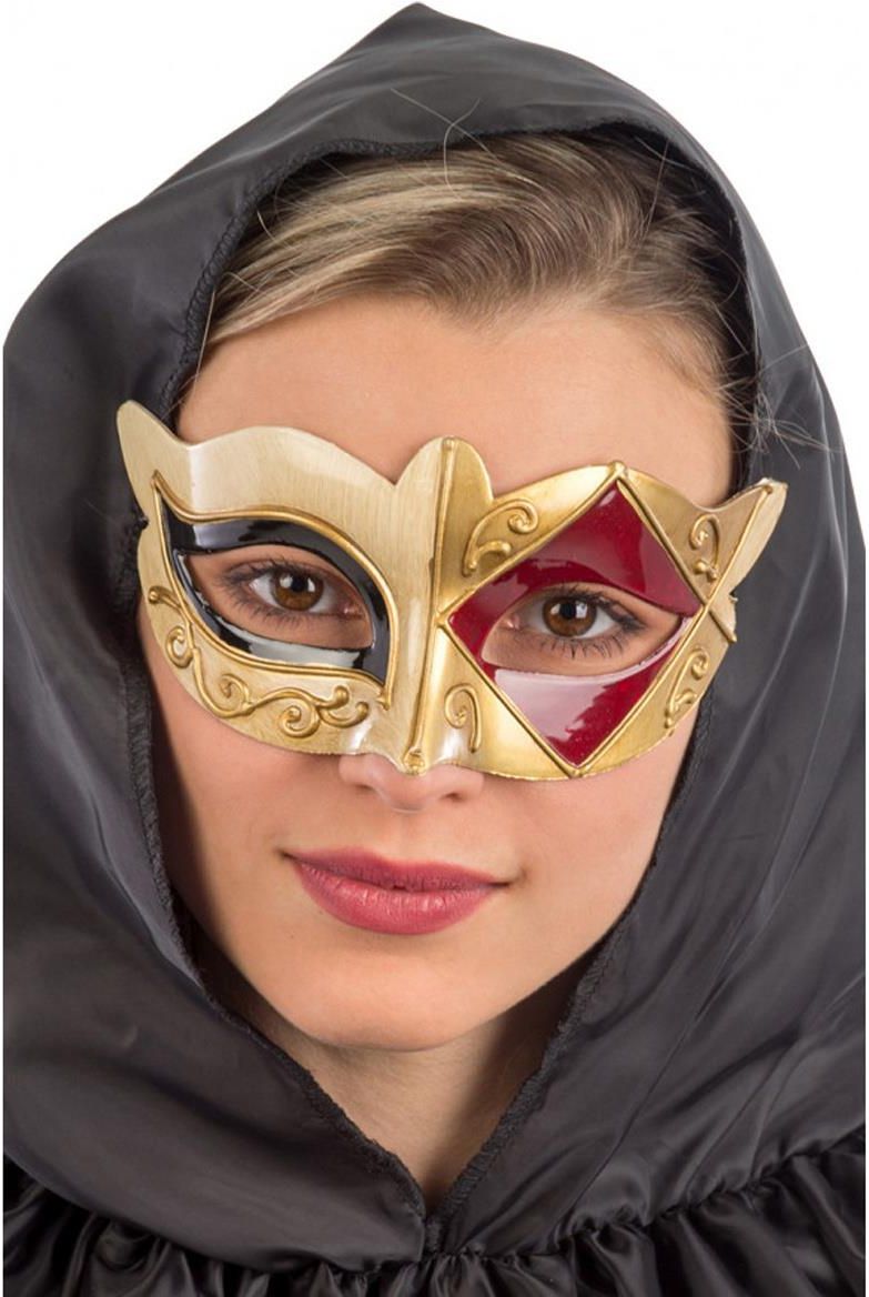 Maska wenecka złota wykonana z plastiku z czerwono-czarnymi dodatkami. Świetnie nadaje się jako dodatek do stroju na karnawał czy imprezę noworoczną. Sprawdzi się także jako dekoracja i ozdoba sali czy pokoju. Opakowanie: 1 szt.