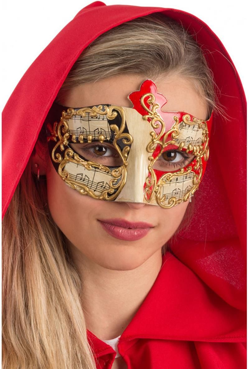 Wenecka maska ze złotymi zdobieniami. Maska jest w trzech odcieniach - czarnym, czerownym oraz kremowym. Pomiędzy wypukłymi złotymi zdobieniami namalowana jest pięciolinia z nutami. Przepiękny sposób by przekazać całemu światu swoją miłość do muzyki i wyglądać fantastycznie na imprezie karnawałowej …