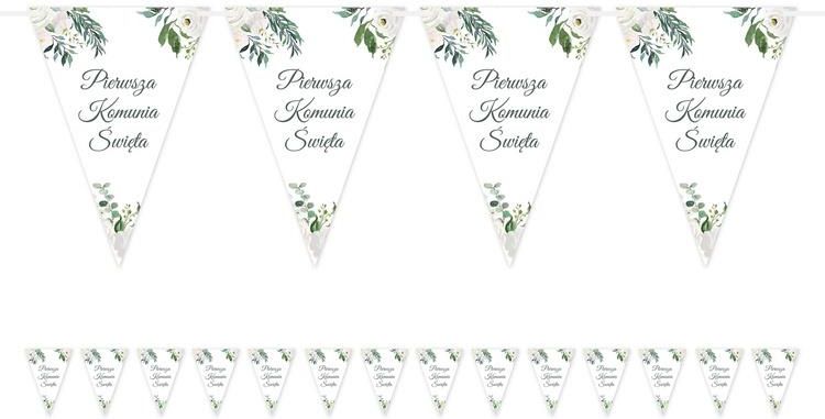 Papierowy baner komunijny z napisem Pierwsza Komunia Święta. Długość wstążki: 500 cm. Wymiary flagi: 10,5 x 15 cm. Ilość flag: 14 szt. Opakowanie: 1 szt.