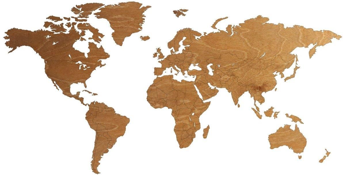 Drewniana dekoracja na ścianę - mapa świata z granicami państw. Materiał: sklejka 6 mm. Wymiary mapy: 130 x 66 cm. Kolor: dąb, malowane bejcą. Do zestawu dodajemy szablon dekoracji, aby prawidłowo nakleić ją na ścianę.
