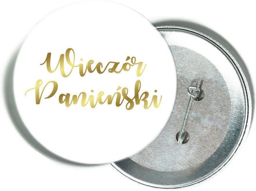 Kotylion na agrafce ze wzorem na wieczór panieński. Przypinka biała ze złotym napisem wieczór panieński. Wielkość: 56 mm. Opakowanie: 1 szt.