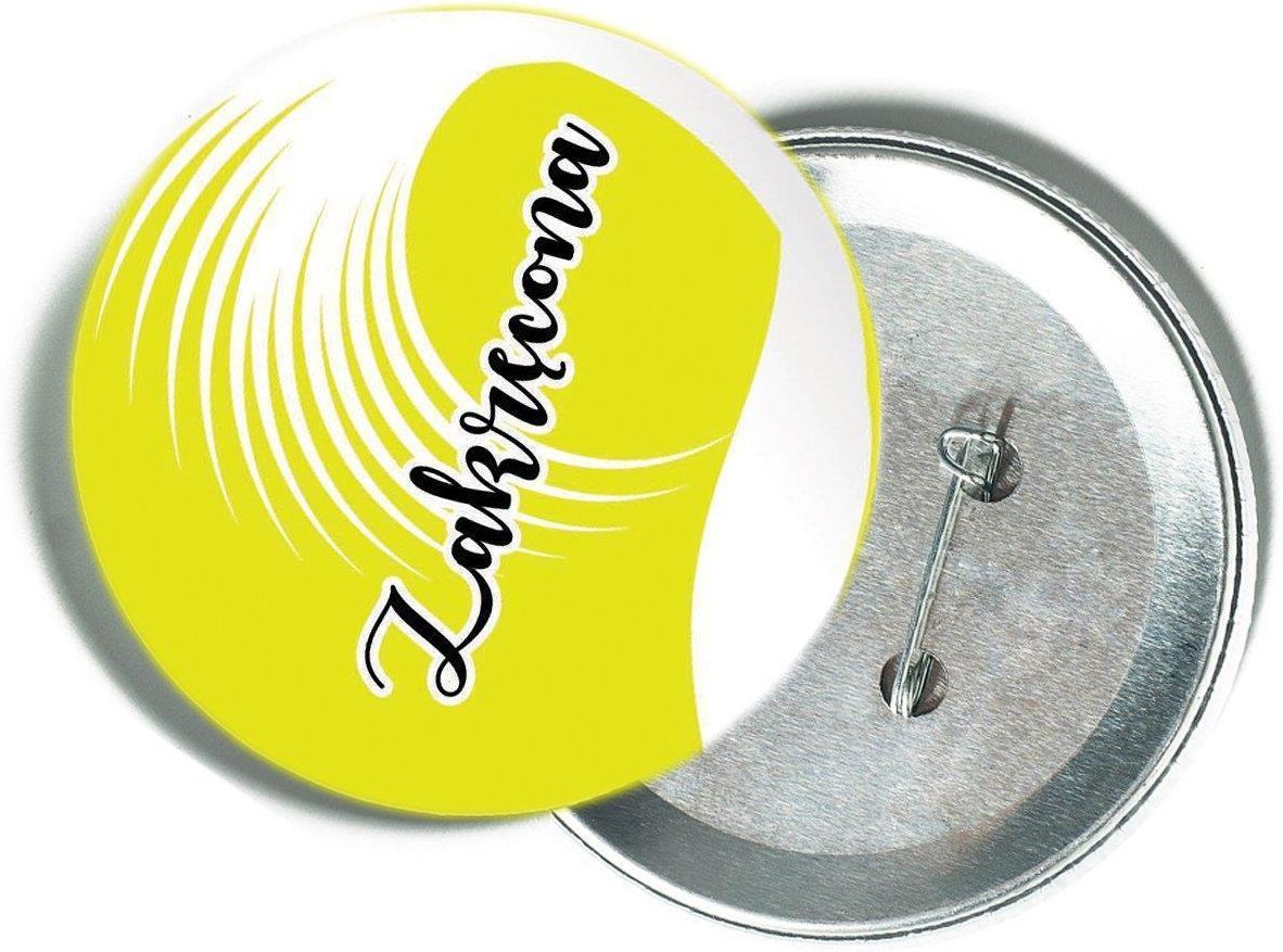 Kotylion na agrafce ze wzorem na wieczór panieński. Przypinka żółta z napisem Zakręcona. Wielkość: 56 mm. Opakowanie: 1 szt.