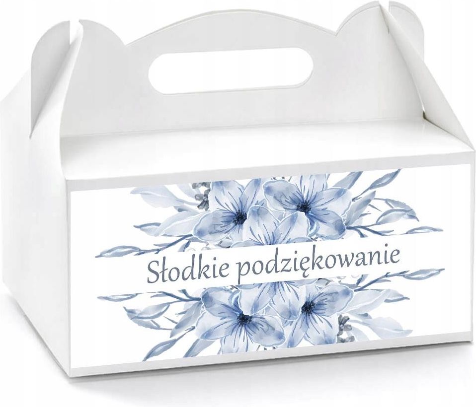 Pudełka na ciasto z kwiatami - 6 szt. Kod produktu: PUDCS-WES45 Zestaw pudełka białe na ciasto z naklejkami ślubnymi w motywie niebieskich kwiatów. Naklejki do samodzielnego przyklejenia. Wymiarami dopasowane do dłuższego boku pudełka. Rozmiary po złożeniu: długość 19 cm, szerokość 14 cm, wysokość 9 cm. Produkt posiada atesty do kontaktu z żywnością. Opakowanie: 6 szt.