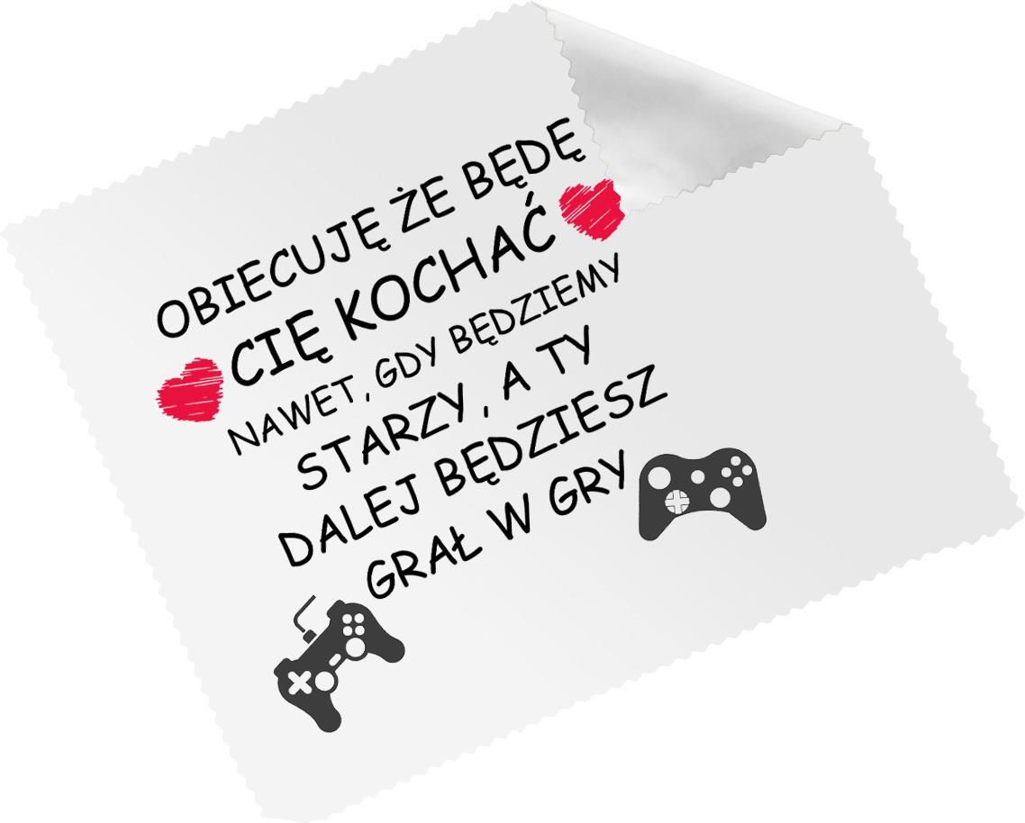 Ściereczka z białej mikrofibry do okularów z napisem "Obiecuję, że będę Cię kochać nawet, gdy będziemy starzy, a Ty dalej będziesz grał w gry" na Walentynki. Wymiary: 10 x 15 cm.