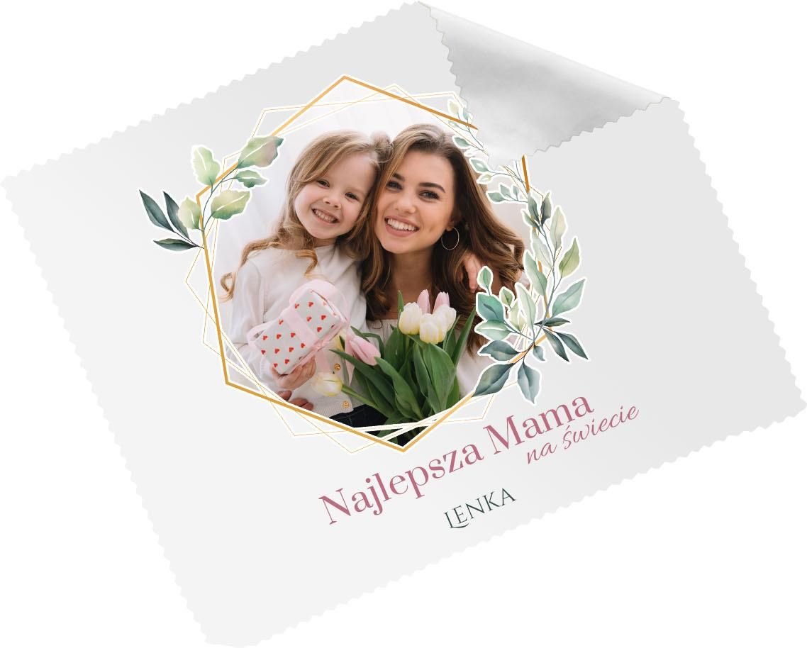 Ściereczka z białej mikrofibry do okularów z personalizacją dla mamy na dzień matki. Zdjęcie oraz imię dziecka można zamieścić w załączniku do zamówienia lub wysłać mailowo. Wymiary: 10 x 15 cm.