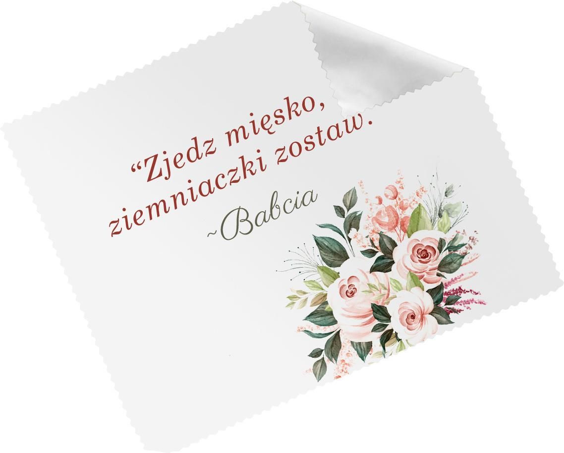 Ściereczka z białej mikrofibry do okularów dla babci na dzień babci. Wymiary: 10 x 15 cm.