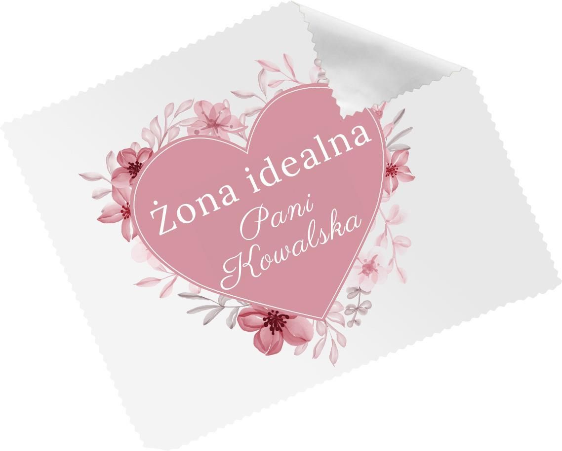 Ściereczka z białej mikrofibry do okularów z napisem "Żona idealna" na Walentynki. Wymiary: 10 x 15 cm. Dane do ściereczki prosimy podawać w notatce do zamówienia.
