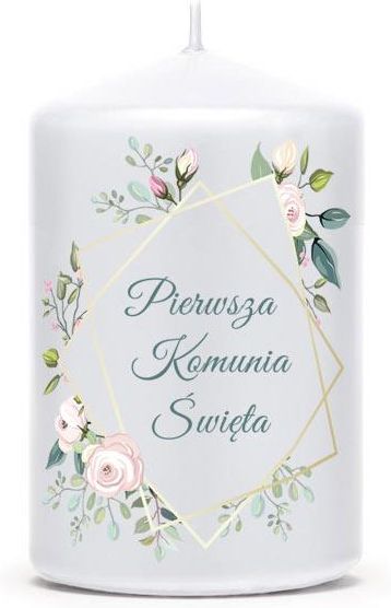 Świeca klubowa matowa w kolorze białym z naklejką Pierwsza Komunia Święta oraz ozdobnym wzorem. Idealny dodatek na Pierwszą Komunię Świętą. Wysokość: 9 cm. Średnica: 6 cm. Opakowanie: 1 szt.