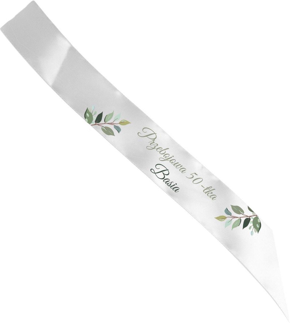 Szarfa atłasowa z indywidualnym imieniem na pięćdziesiątkę. Prosimy podać imię jakie ma być umieszczone na szarfie. Kolor szarfy: biały. Rozmiar: ok 70cm (rozłożona 140) x 10 cm. Opakowanie: 1 szarfa, pasek klejowy.