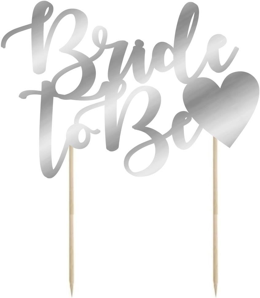 Napis Bride To Be z sercem na piku w kolorze srebrnym, idealna dekoracja tortu i nie tylko na Wieczór Panieński. Napis wycięty w sztywnym, lustrzanym papierze. Zestaw DIY. Wielkość: dekoracja 14x10 cm, patyczek 11 cm. Opakowanie: 1 szt.