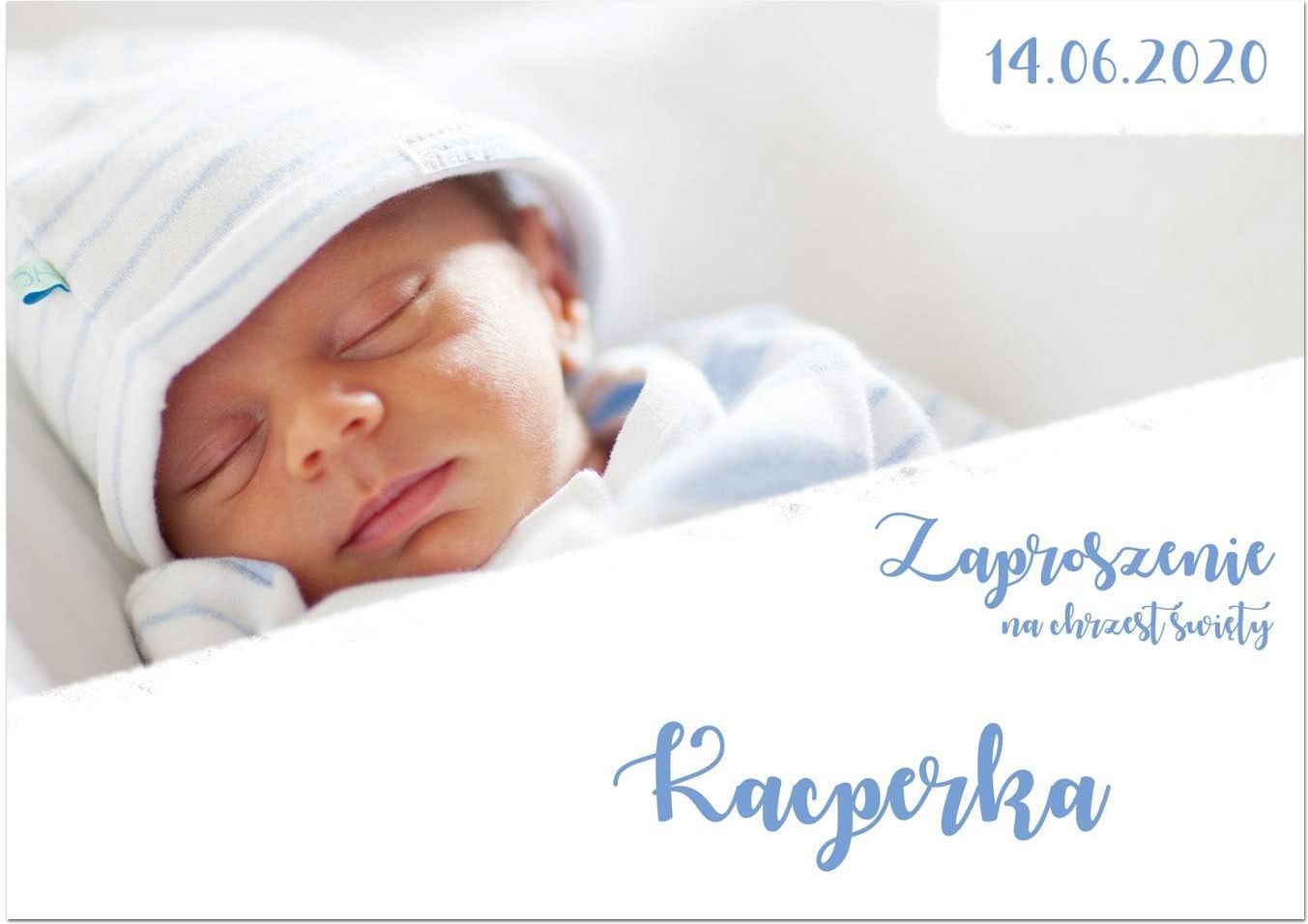 Zaproszenia personalizowane ze swoim zdjęciem na chrzest chłopca. Wielkość: 10x14 cm. Opakowanie: 8 szt.