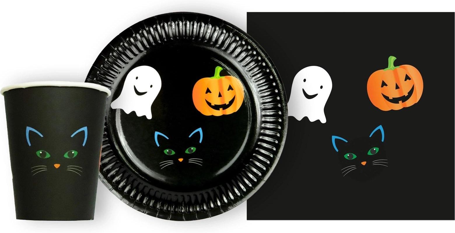 Zestaw papierowych naczyń na Halloween z motywem dla dzieci Duch Kot Dynia. W komplecie: Kubeczki: - 250 ml - 12 szt. Talerzyki: - 18 cm - 12 szt. Serwetki: - 33 cm - 20 szt. Opakowanie: 44 szt.