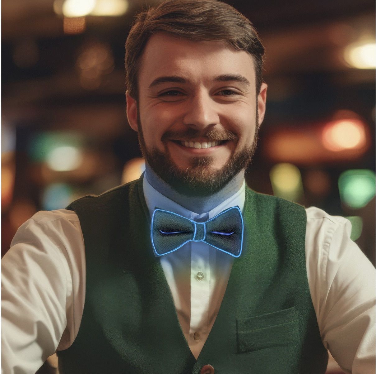 Czarna mucha z paskami LED. Idealnie sprawdzi się jako dodatek do kostiumu np. na Halloween lub Wieczór Kawalerski. Produkt zasilany na baterie 2 X AA. (baterie nie znajdują się w zestawie) Kolor: niebieski. Wymiary: 12 x 2 cm. Opakowanie: 1 szt.