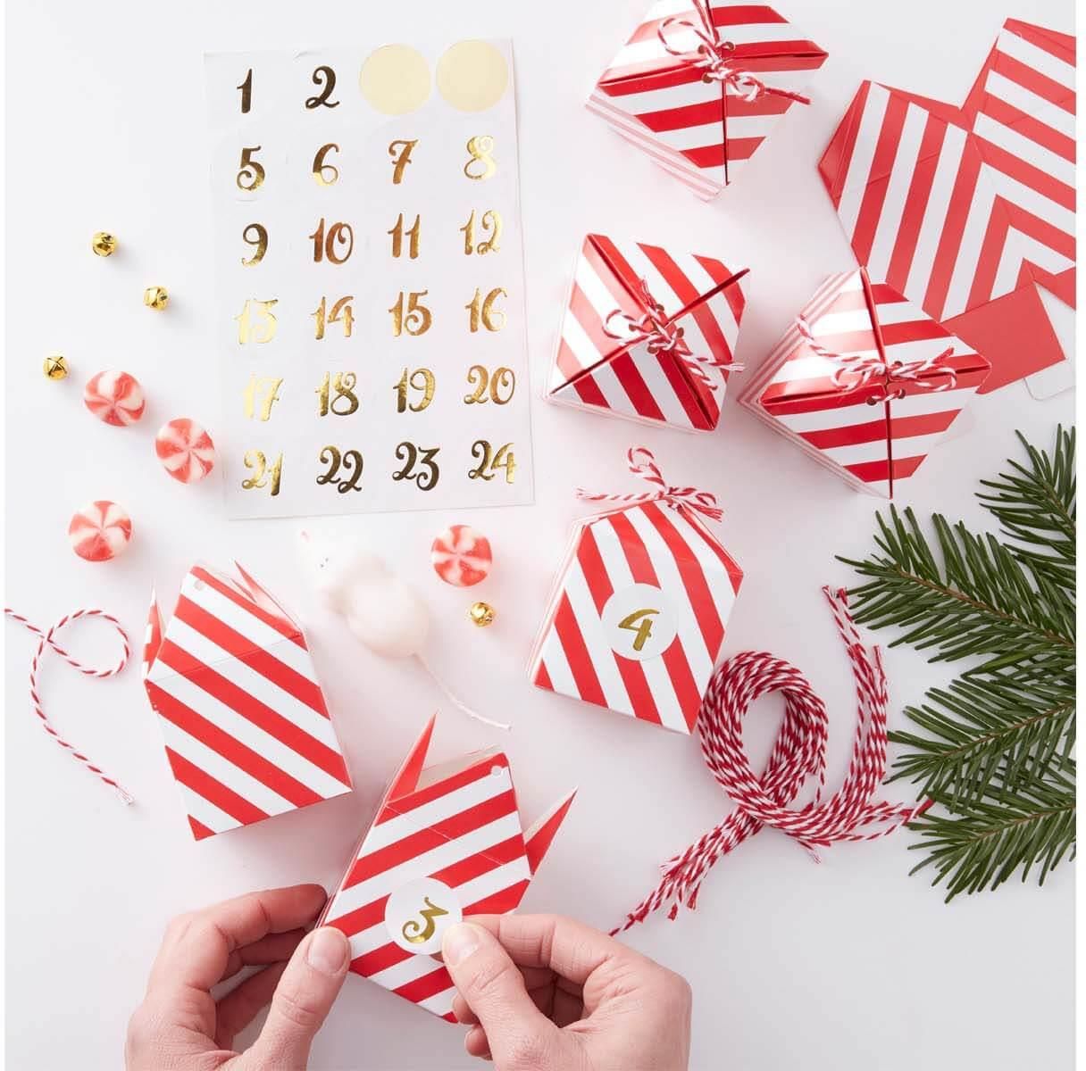 Kalendarz adwentowy na Boże Narodzenie. W zestawie: 24 pudełeczka, arkusz naklejek z cyferkami oraz czerwono-biały sznurek piekarski. Wielkość pudełeczka: 9 cm x 9 cm x 2,5 cm. Opakowanie: 1 komplet.