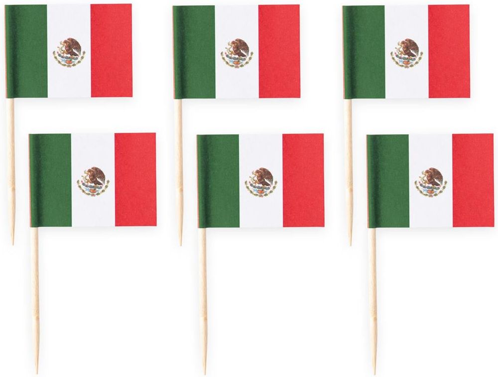 Wykałaczki, pikery z flagą narodową Meksyku. Wymiary flagi: 3,5 x 2,5 cm. Wysokość pikera: 6,5 cm. Opakowanie: 50 szt.