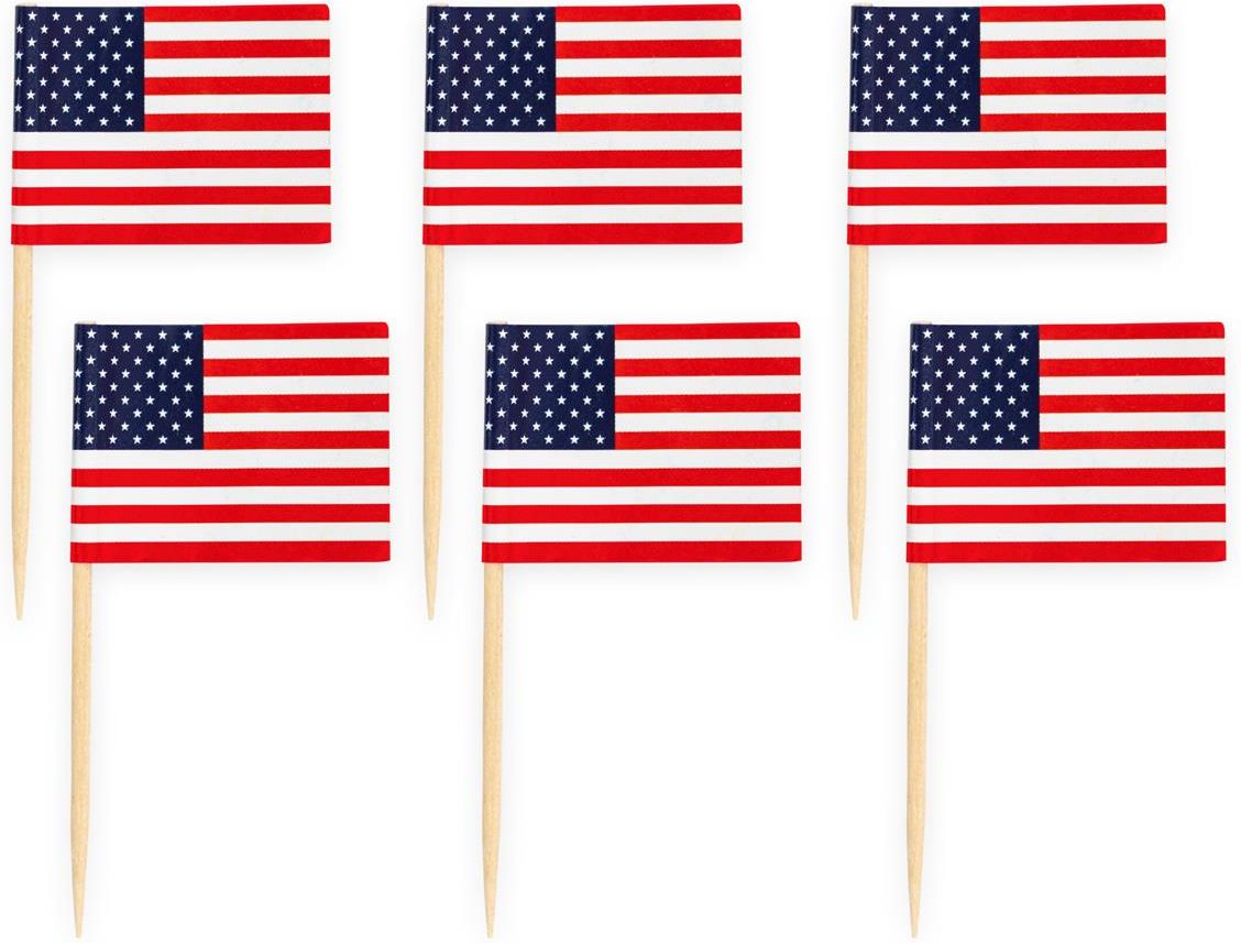 Wykałaczki, pikery z flagą narodową Stanów Zjednoczonych Ameryki. Wymiary flagi: 3,5 x 2,5 cm. Wysokość pikera: 6,5 cm. Opakowanie: 50 szt.